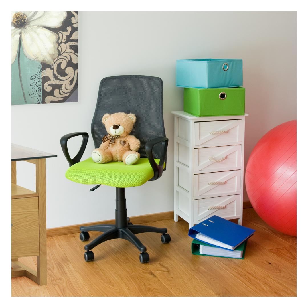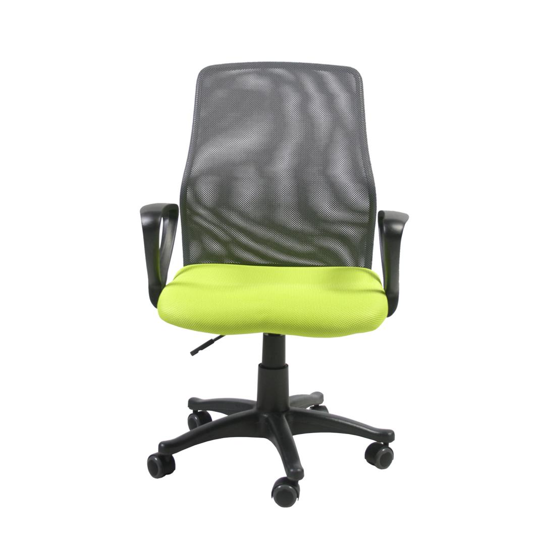 Task chair TREVISO green/grey. The seat is covered with green polyester mesh fabric, 30 000 Martindale's. The backrest is covered with grey polyester mesh fabric. The frame is black. Pneumatic seat height adjustment. The armrests and base are made of plastic. The chair has rubber castors, pin: 11mm. Height 90-102cm, seat height 44-56cm, seat depth 47cm, seat width 48cm. The dimensions of the product are 59x58xH90-102cm. The weight capacity is 90kg.
