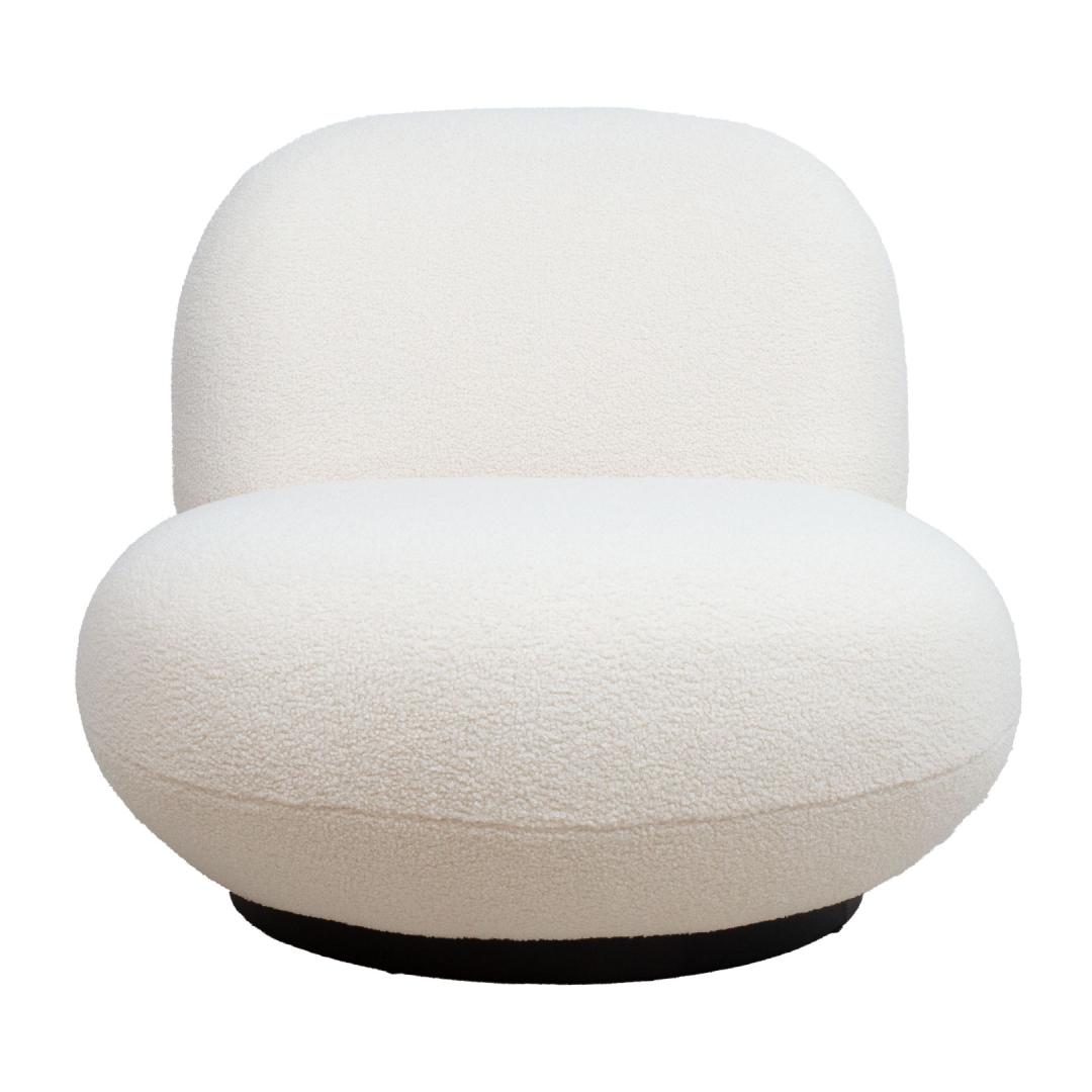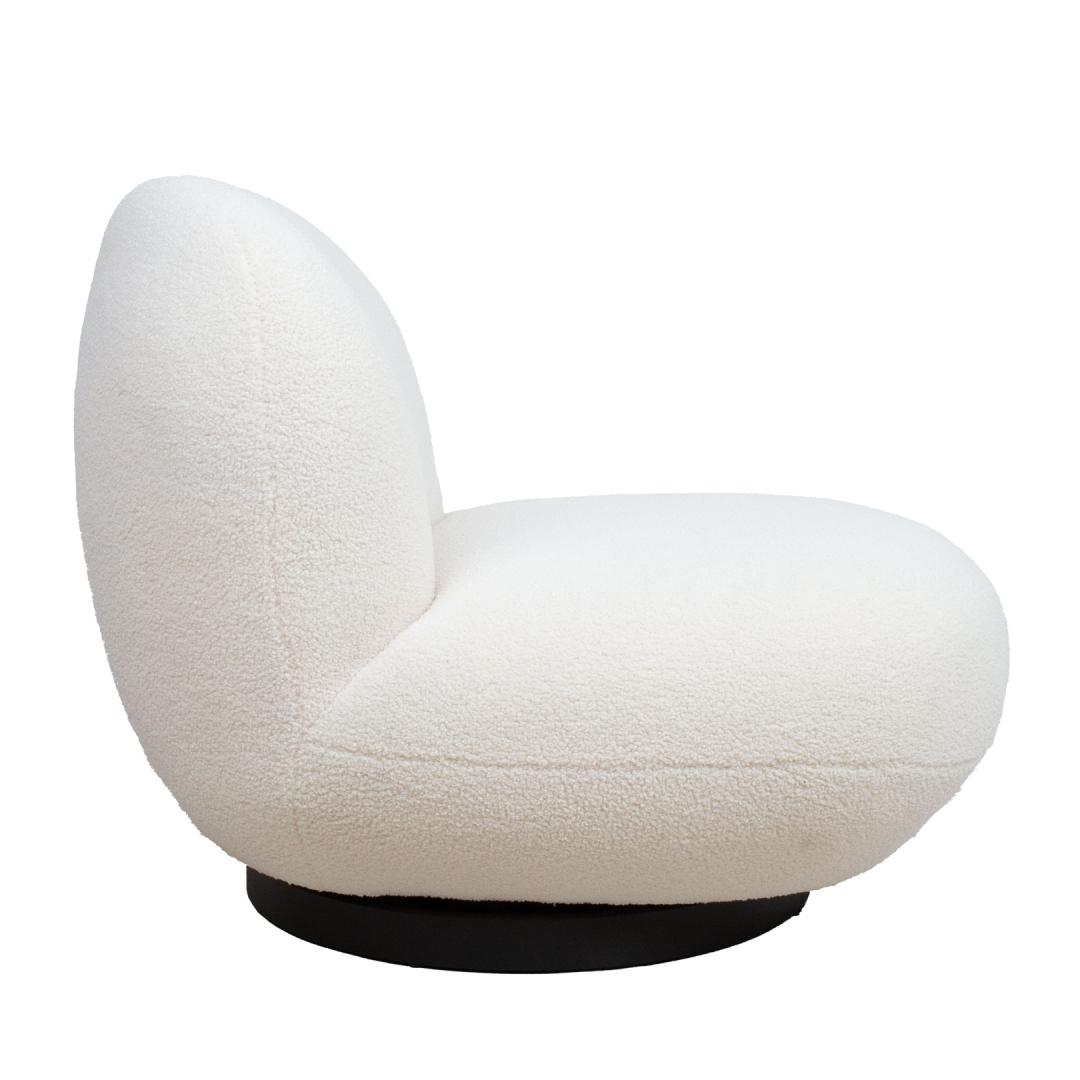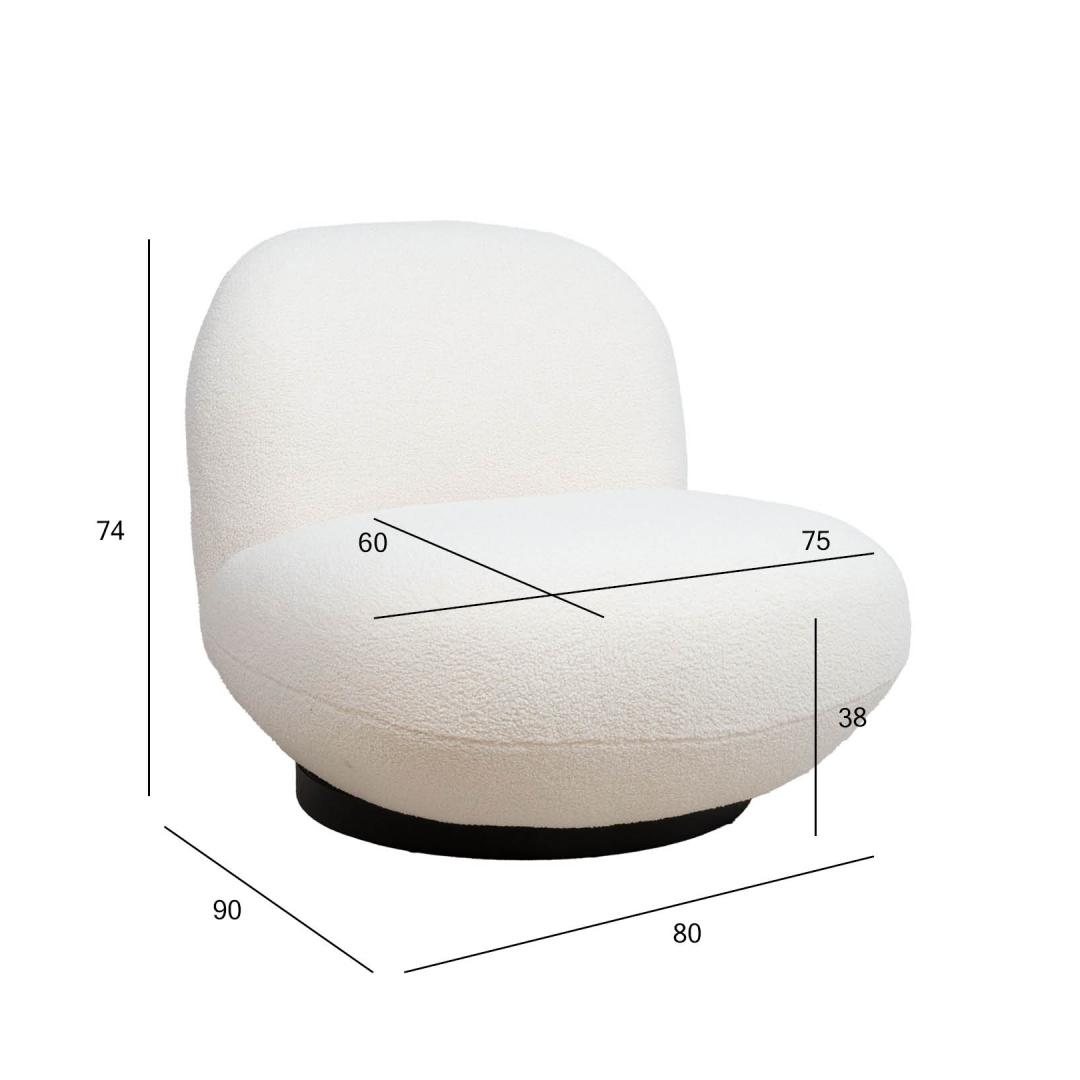 Leisure chair PAMELA white. Round and soft, the 360° swivel armchair covered with furry fabric is an eye-catching furnishing element that is easy to integrate into a space with different styles or purposes. Cover material: 100% polyester fabric. The frame of the chair is made of wood and plywood. Inside the seat is a pocket spring block. The padding consists of polyurethane foam and polyester fiber. The overall dimensions of the armchair are 80x90xH74cm. The seat width is 75cm, the seat depth is 60cm, and the seat height is 38cm Tugitool PAMELA valge. Ümar ja pehme, karvase kangaga kaetud 360 °pöörlev tugitool on pilkupüüdev sisustuselement, mida on lihtne sobitada erineva stiili või otstarbega ruumi. Kattematerjal: 100% polüesterkangas. Tooli karkass on valmistatud puidust ja vineerist. Istme sees on pocket vedruplokk. Polsterduseks on kasutatud polüuretaanvahtu ja polüesterkiudu. Tugitooli üldmõõdud on 80x90xH74cm. Istme laius 75cm, istme sügavus 60cm, istme kõrgus 38cm.
