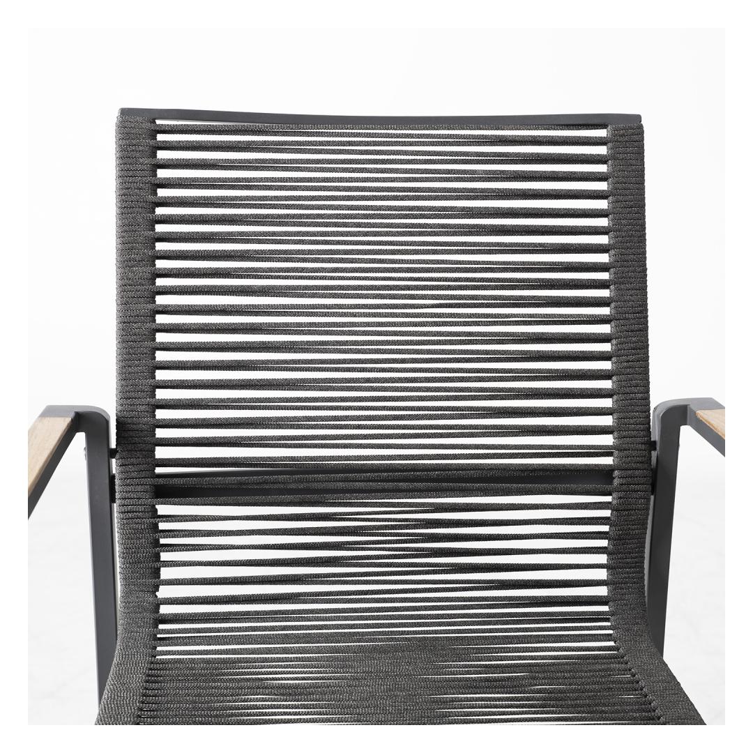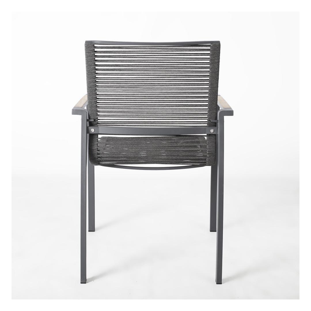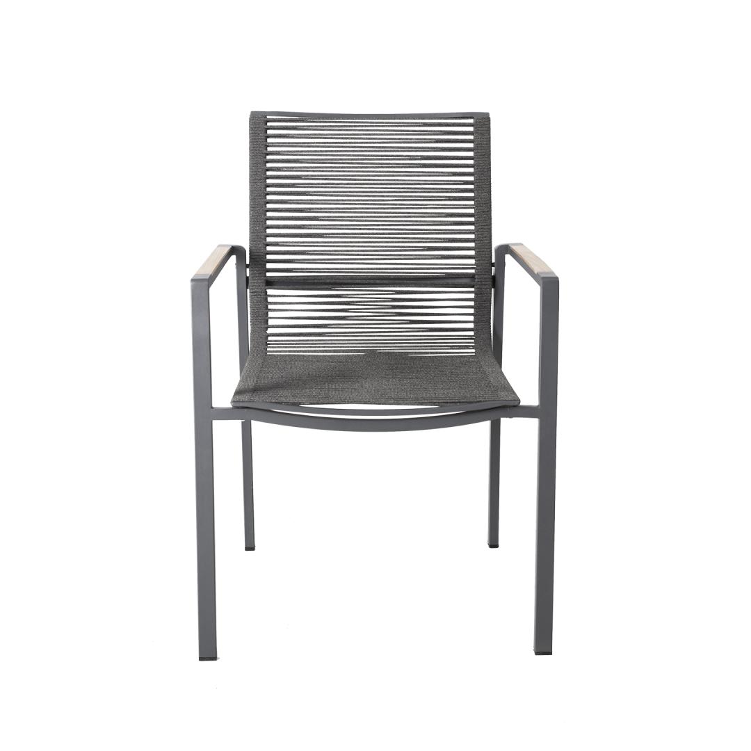 Chair MONTANA grey. The stainless steel frame of the chair is finished with gray powder coating. The seat and backrest are covered with rope weaving. The armrests are decorated with natural teak slats. The chairs are stackable and easy to store and save space. The overall dimensions of the chair are 60x61xH90cm, seat height 45cm, seat width 48cm, seat depth 48cm, backrest height 48cm, armrest height from the ground 65cm. Weight limit 120kg. Product is durable in changing weather conditions and easy to maintain. STORAGE: at the end of the summer season, we recommend storing garden furniture indoors. Clean and dry furniture before storing. Use a dry, well-ventilated room for storage. Tool MONTANA hall. Tooli roostevabast terasest raam on viimistletud halli pulbervärviga. Iste ja seljatugi on kaetud nöörpunutisega. Käetugesid kaunistavad naturaalsest tiikpuust liistud. Toolid on virnastatavad ning nende hoiustamine on lihtne ja ruumi säästev. Tooli üldmõõdud on 60x61xH90cm, istme kõrgus 45cm, istme laius 48cm, istme sügavus 48cm, seljatoe kõrgus 48cm, käetoe kõrgus maast 65cm. Kaalupiirang 120kg. Toode on muutlikes ilmastikutingimustes vastupidav ja lihtsalt hooldatav. HOIUSTAMINE: suvehooaja lõppedes soovitame aiamööblit hoiustada siseruumides. Puhastage ja kuivatage mööbel enne hoiule panekut. Kasutage hoiustamiseks kuiva ning hea ventilatsiooniga ruumi.