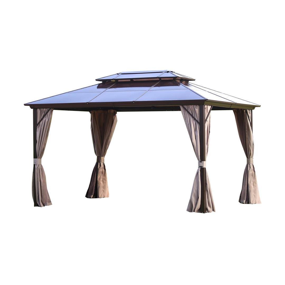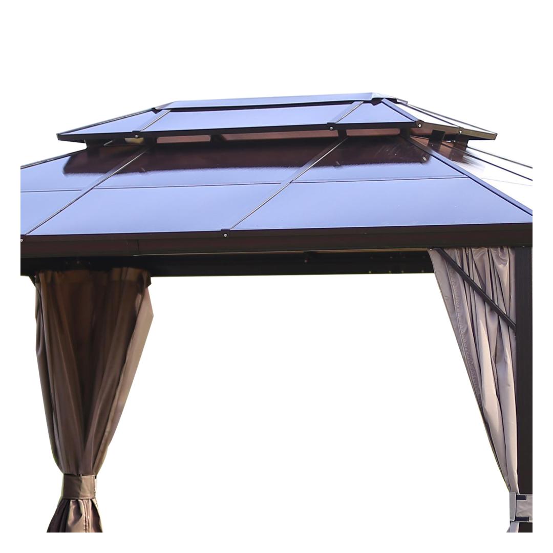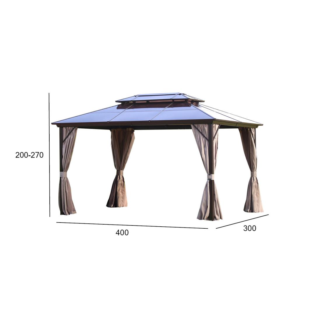 Canopy SUNSET 3x4xH2/2.7m, brown/taupe. The elegant and functional canopy/garden pavilion offers protection and shade from both light rain and scorching sun and allows you to enjoy being outdoors regardless of the weather and time of day. On all sides of the canopy there are polyester fabric (180g/m²) curtains and zippered nylon mosquito nets. The main structure of the canopy is made of aluminum. All parts of the frame are finished with brown powder paint. The dimensions of the side pillars are 76x76mm, the dimensions of the crossbeam are 116x76mm, the roof ribs are 38.5x41.3mm. Roof panels: 6 mm polycarbonate or laminated plastic. Polycarbonate is a weatherproof, environmentally friendly material that offers a unique combination of durability with very good impact strength. The material also has good light transmission and high temperature tolerance. WARNING: Do not leave the canopy unattended during extreme weather conditions or a storm warning. Strong wind, rain or snow can damage the canopy. STORAGE: to extend the life of the canopy, we recommend disassembling it at the end of the summer season and storing it in a cool, dry and well-ventilated room. If the canopy is left up for the winter, it must be ensured that too much snow does not accumulate on the roof. Remove accumulated snow as soon as possible. At the end of the summer season, remove mosquito nets and curtains. Clean and dry curtains before storing. Varikatus SUNSET 3x4xH2/2,7m, pruun/taupe.