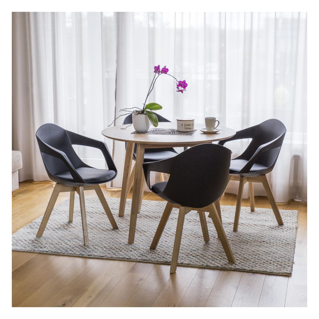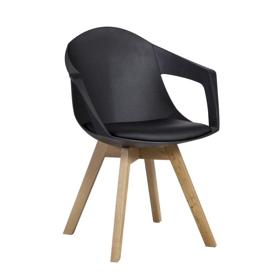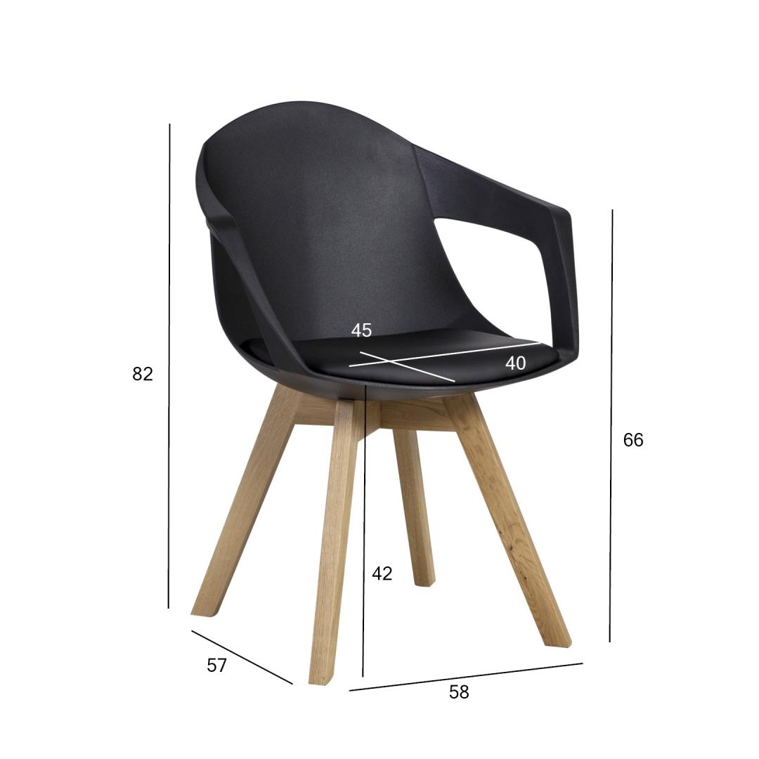 Chair STUART. The chair has a black plastic seat with a comfortable shape. The upholstered seat base is covered with black artificial leather. Light oak legs. The overall dimensions of the chair are 58x57xH88cm. Seat height 42cm, seat width 40cm, seat depth 45cm. Weight limit 100 kg.