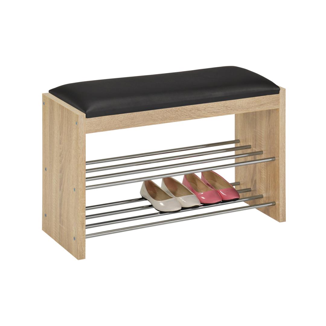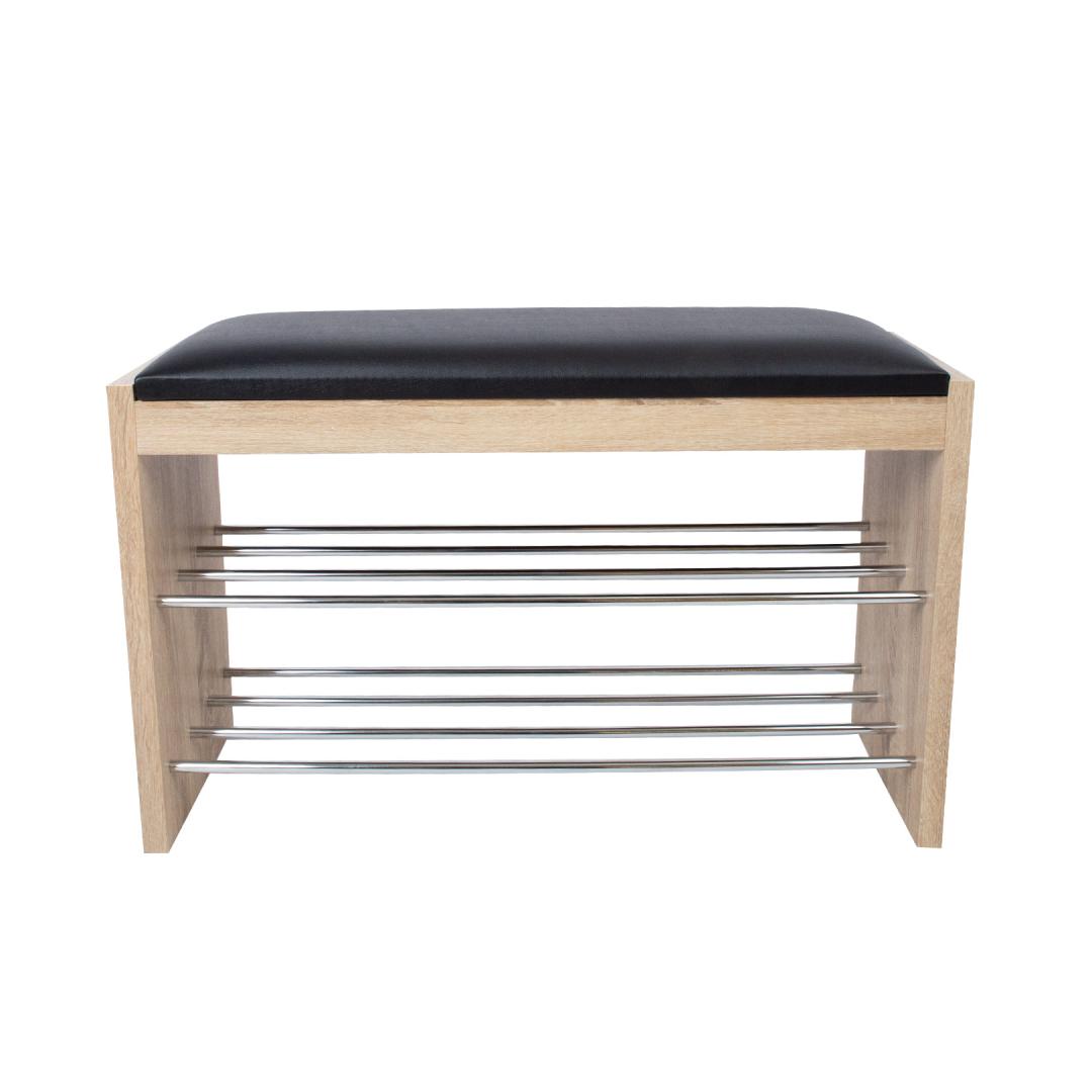 Shoe rack-bench BENO 79.5x30xH50cm, light oak. The frame of the shelf is made of laminate board with oak bark. The seat is lightly padded and covered with black artificial leather (PVC). Under the seat there are 2 shoe racks made of chromed steel tubes.