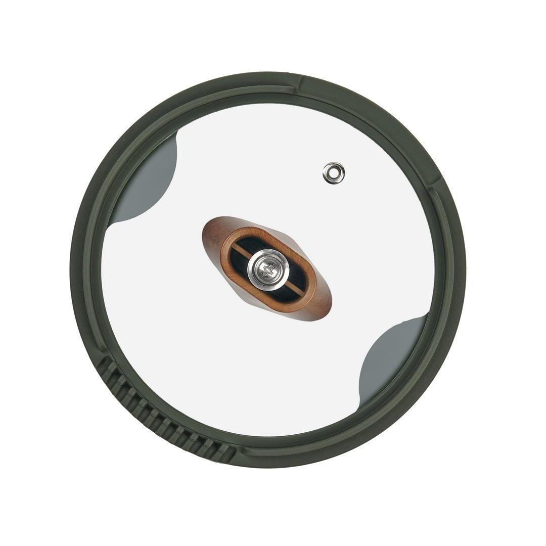 Glass lid with silicone rim and double-sided drain features silicone inserts to protect fingers when draining water