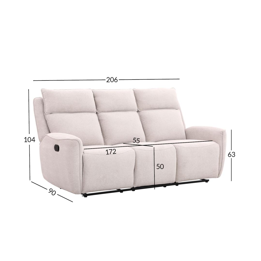Diivani üldmõõdud on 206x90xH104cm. Istme laius 172cm, istme sügavus 55cm, istme kõrgus 50cm. Käetoe kõrgus maast 63cm. Diivan MAREN 3-kohaline manuaalne recliner, beež.