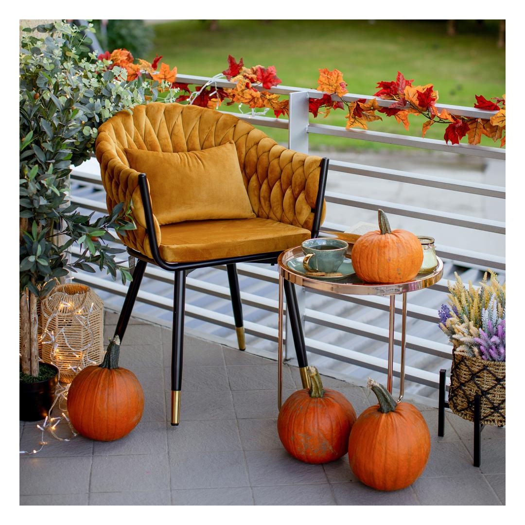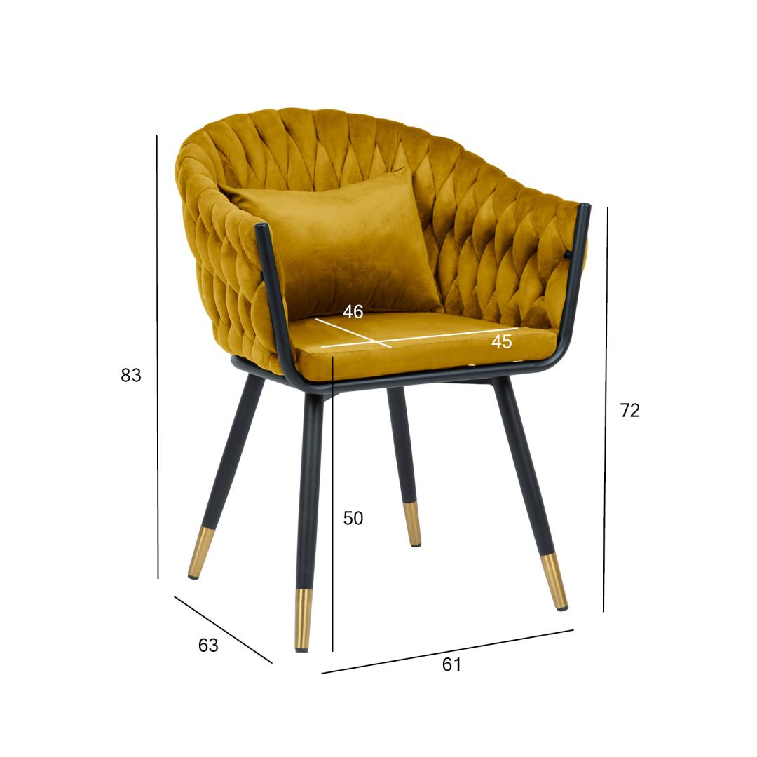 Tool FLORA kuldkollane samet. Tooli iste ja seljatugi on polsterdatud ja kaetud sametkangaga. Seljatoe mahuline, pehmeid laineid meenutav polster on saavutatud kasutades punumistehnikat. Väike lisapadi tooli seljatoel tagab suurema istumismugavuse. Padja mõõdud 38x28cm. Kattematerjal: 100% polüester, 260g/m². Martindale 25 000. Tooli jalad ja raam on valmistatud metallist ja viimistletud musta pulbervärviga, jalgade alumised otsad on kuldsed. Tooli üldmõõdud on 61x63xH83cm, istme laius 45cm, istme sügavus 46cm, istme kõrgus 50cm. Seljatoe kõrgus 38cm. Kaalupiirang 120kg.