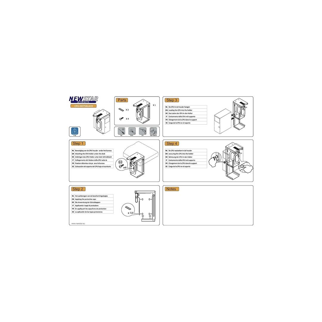 Weight 1.4 kg This NewStar CPU mount, model CPU-D075BLACK, allows you to mount a computer under a desk. A CPU mount creates a need and clean desk because its stored under the desk and doesn’t use any valuable desk space. Increase the lifetime of your CPU due to reduction intake dust and dirt from floors. Keep the workplace clean without computers on the floor.