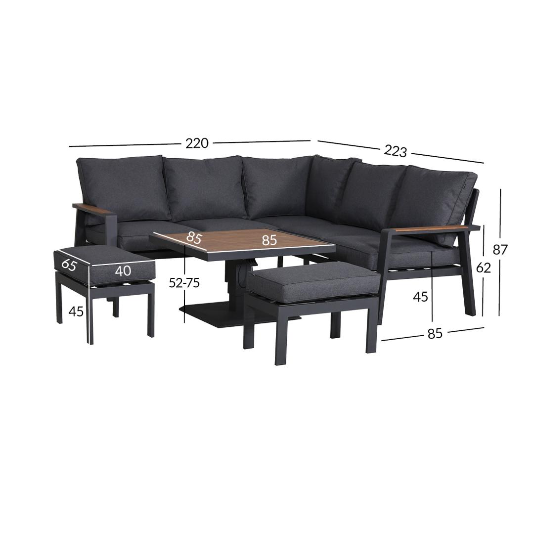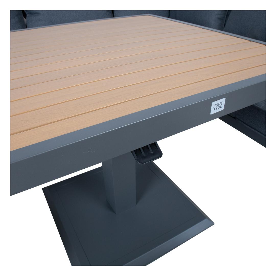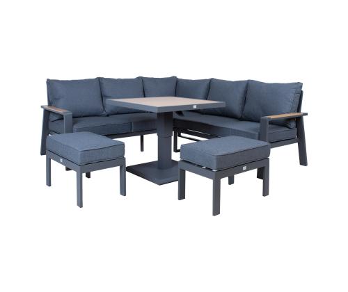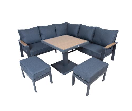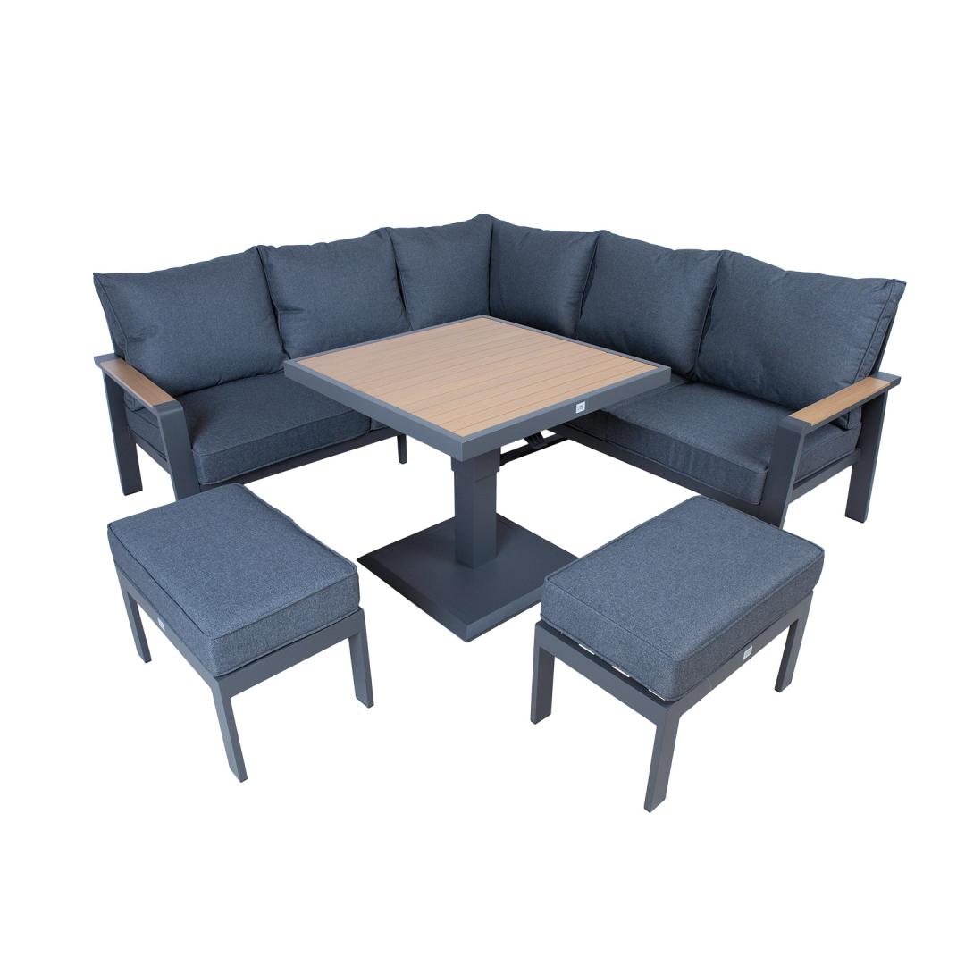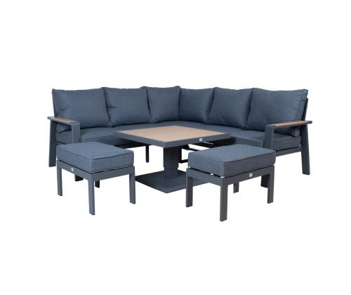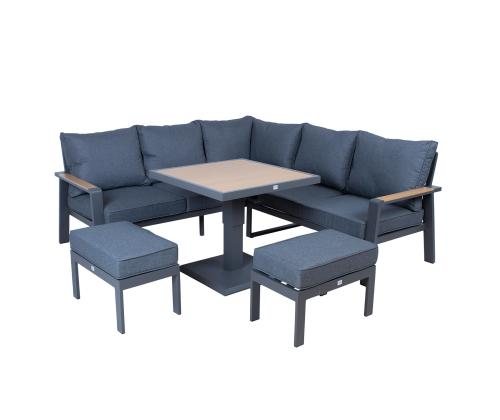 The set includes a table with adjustable height, a corner sofa and 2 ottomans. The frames of all parts of the set are made of aluminum and finished with a grey powder coating. The surface finish of the tabletop and chair armrests, reminiscent of the texture of the natural wood grain has been achieved using the thermal transfer printing method. The surface finished in this way is very durable and withstands both sunlight and light scratches.