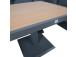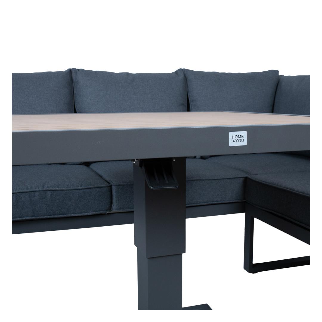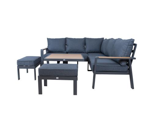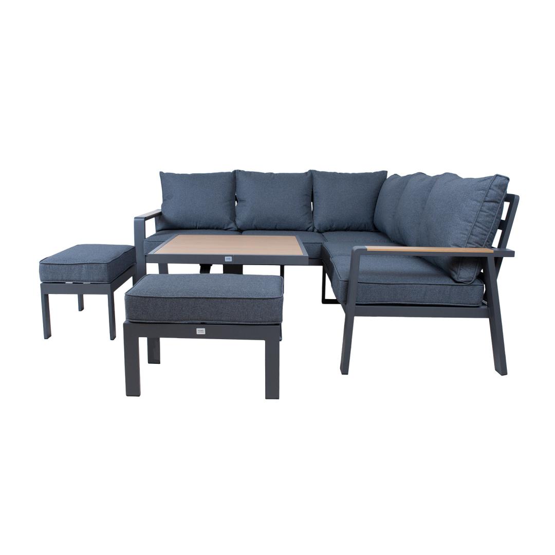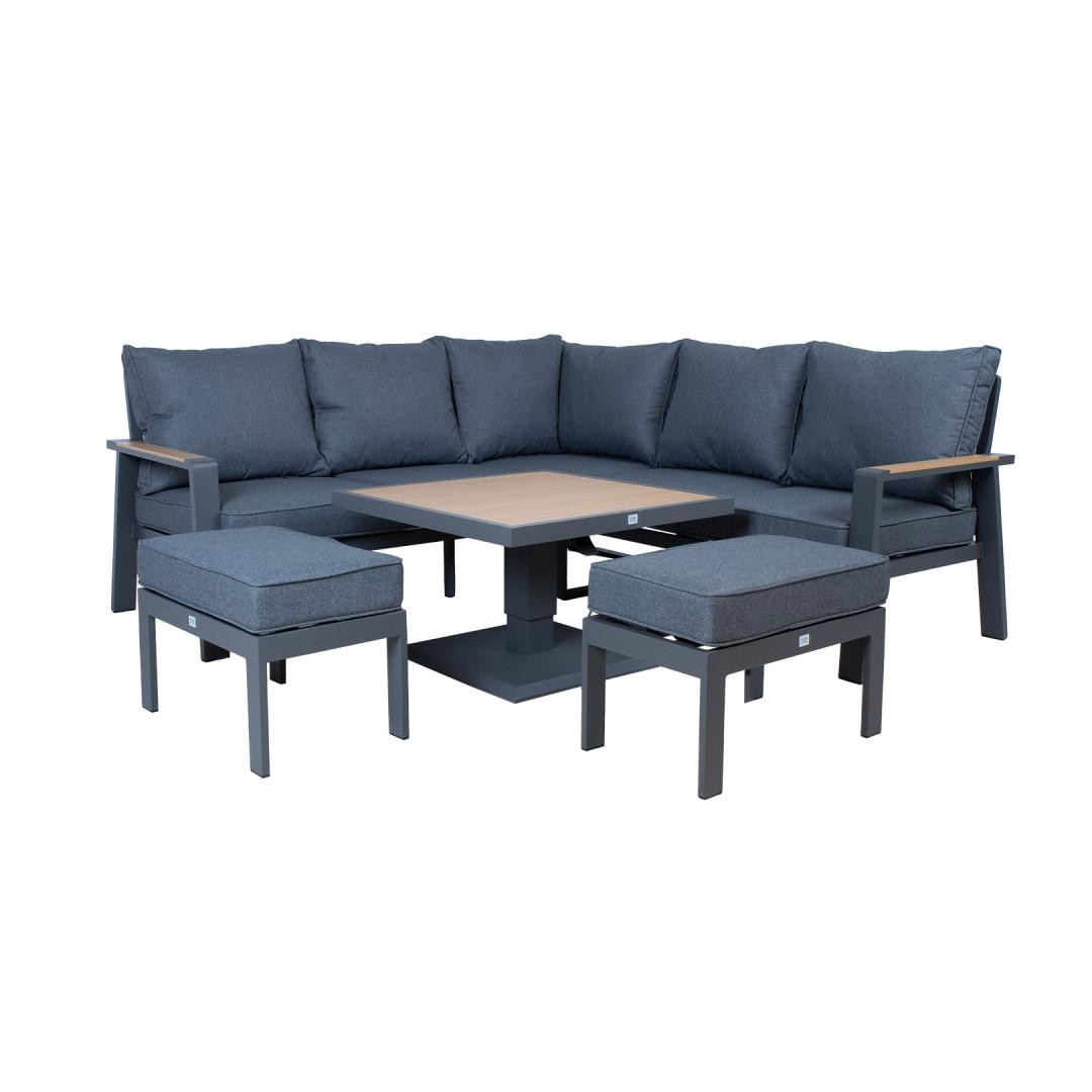The set includes a table with adjustable height, a corner sofa and 2 ottomans. The frames of all parts of the set are made of aluminum and finished with a grey powder coating. The surface finish of the tabletop and chair armrests, reminiscent of the texture of the natural wood grain has been achieved using the thermal transfer printing method. The surface finished in this way is very durable and withstands both sunlight and light scratches.