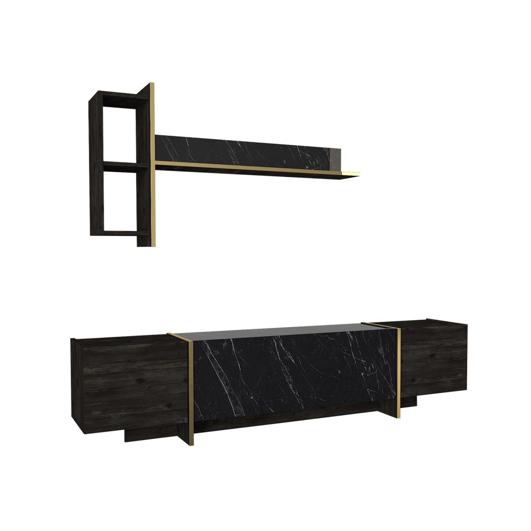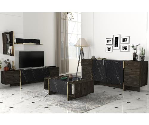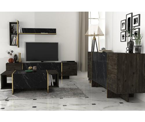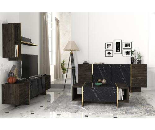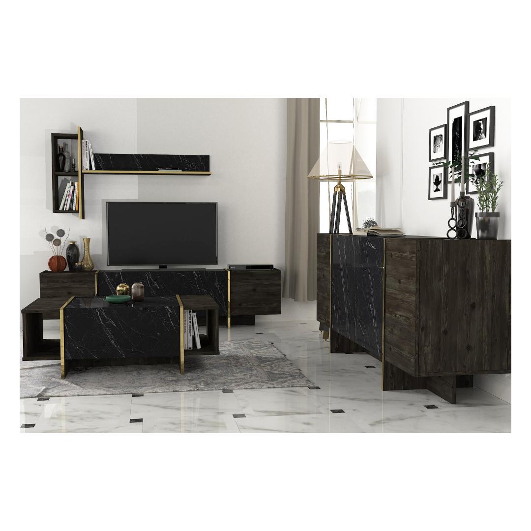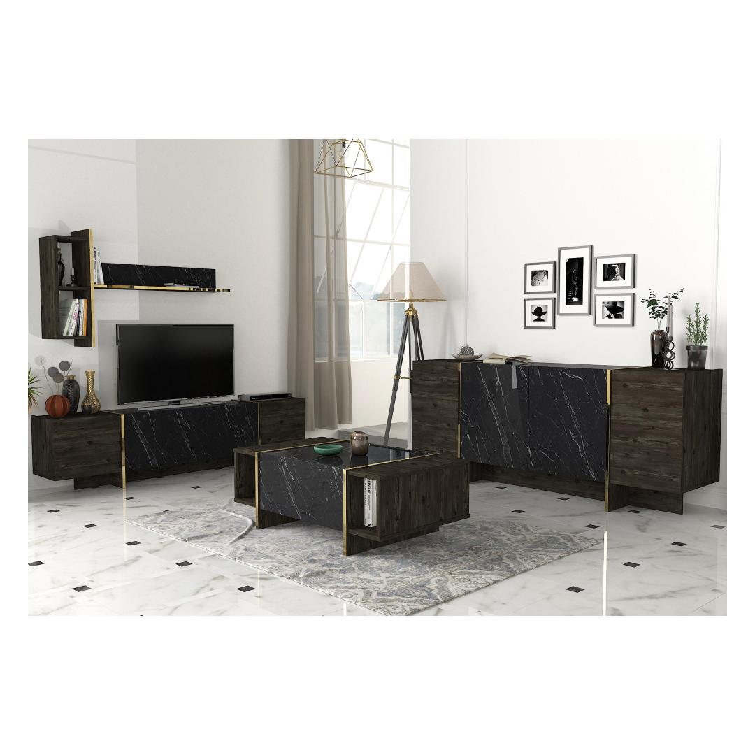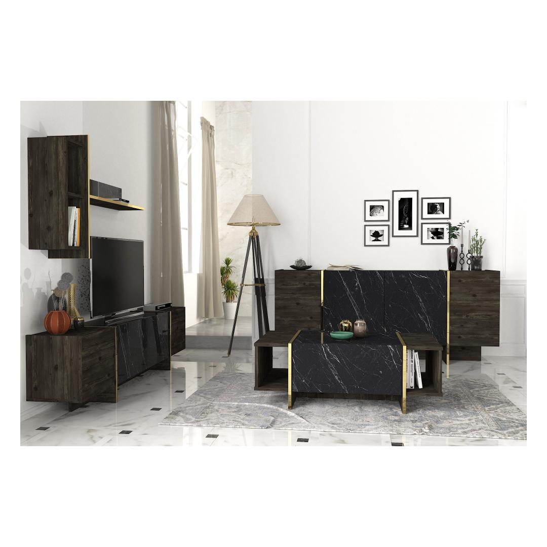 Muuda oma elutuba luksuslikuks pelgupaigaks meie suurepärase elutoa mööblikomplektiga. See komplekt on valmistatud 100% melamiiniga kaetud puitlaastplaadist, mis õhkab elegantsust ja elegantsust. Tõstke oma elutuba kõrgemaleMeie elutoa mööblikomplekt on oma elegantse disaini ja laitmatu käsitööga stiili ja mugavuse kehastus. Olenemata sellest, kas korraldate koosviibimist või naudite kodus rahulikku õhtut, see komplekt loob täiusliku atmosfääri mis tahes sündmuseks.Võrratu kvaliteetMeie mööblikomplekt on valmistatud 18 mm paksusest melamiiniga kaetud puitlaastplaadist, mis on ehitatud kestma. See on vastupidav kriimustuste, plekkide ja niiskuse suhtes, tagades, et see säilitab oma ilu aastaid. Monitoorne ja funktsionaalneSee komplekt sisaldab mitmeotstarbelist lauda, televiisorikomplekti ja konsooli, mis pakub piisavalt ruumi kõigi oluliste asjade hoidmiseks. Arvukad riiulid ja täiendavad hoiuvõimalused muudavad teie elutoa korrastatuna ja segadusteta hoidmise lihtsaks. Elektilisuse puudutusMeie elutoa mööblikomplekt, mis on varustatud musta ja kuldse värvi uimastava kombinatsiooniga, lisab igale ruumile külluslikkust. Elegantne disain ja luksuslik viimistlus teevad sellest väljapaistva eseme, mis avaldab külalistele muljet ja jätab püsiva mulje. Tehnilised üksikasjad:Kohvilaua suurus: Laius: 103. 8 cm, kõrgus: 37. 3 cm, sügavus: 60 cm.Külgriiuli laius: 19. 5 cmJala kõrgus: 10 cmTelerikapi suurus: Laius: 180 cm, kõrgus: 45 cm, sügavus: 32. 3 cmRiiulide kogupikkus: Laius: 121. 6 cm, kõrgus: 70 cm, sügavus: 24. 8 cmKülgmised riiulid: Laius: 19,8 cm, kõrgus: 60 cm, sügavus: 22 cm.Konsooli suurus: Laius: 180 cm, kõrgus: 75. 5 cm, sügavus: 46. 6 cmKapi kõrgus: 60 cmJalgade kõrgus: 15,5 cm Värv: Black Gold