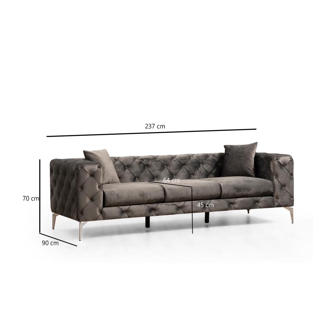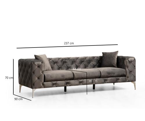 Kogege ülimat mugavust ja stiili meie 3-kohalise diivaniga. See peen mööblitükk on loodud tekitama tugevaid emotsioone ja jätma püsiva mulje. Päratu mugavusVajutage plüšpehmete padjadesse ja kogege sellist mugavust, mida te pole kunagi varem kogenud. 5 cm 28 dns hall vahtpolster ja 5 cm 24 dns sulged istumiseks tagavad täiusliku tasakaalu toetuse ja pehmuse vahel. 24 dns sulg seljatoe jaoks tagab, et saate pärast pikka päeva lõõgastuda ja lõõgastuda.Elegantne disainSee diivan on oma elegantse ja moodsa disainiga tõeline showstopper. Massiivne antratsiitne värvus lisab igasse ruumi elegantsust, muutes selle ideaalseks täienduseks teie elutuppa või kontorisse. Kroomitud metallist jalad lisavad kaasaegset hõngu, samas kui pöögipuidust ja puitlaastplaadist raam tagab vastupidavuse ja pikaealisuse. Monitoorne ja mugav3-kohaline diivan on varustatud nelja padjaga, mis lisab lisamugavust ja stiili. Kaasaskantav istmepadi võimaldab teil oma istumiskorraldust vaevata ümber paigutada, samas kui fikseeritud seljapadi tagab stabiilsuse ja toe. Eemaldatav padjakate muudab puhastamise lihtsaks ning kuivpuhastatav kangas tagab, et teie diivan jääb värske ja puhas. Tehnilised üksikasjad:Raam: Puit: Pöögipuit / puitlaastplaatKangas: Materjal: 100% polüesterLaius: 237 cmKõrgus: 70 cmSügavus: 90 cmVaht: 5 cm 28 DNS hall vaht + 5 cm 24 DNS sulega istumiseks, 24 DNS sulega seljatoeks.4 padja, suurus: 45 cm x 45 cm.% 60 % vahtpolster / % 40 % silikoonvaht.Istme sügavus: 64 cmIstmepadja paksus: 15 cmSeljatoe kõrgus: 70 cmSügavus: 90 cm, laius: 27 cmJalad: Kroomitud metallist jalad: Kroomitud metallist jaladVahu kõrgus: 16 cmEemaldatav padjakateVärv: AntratsiitKontseptsioon: Modern - uudsus, Glam, Hotell, Ühevärviline - Antratsiit Värv: Anthracite