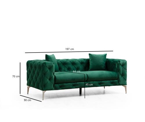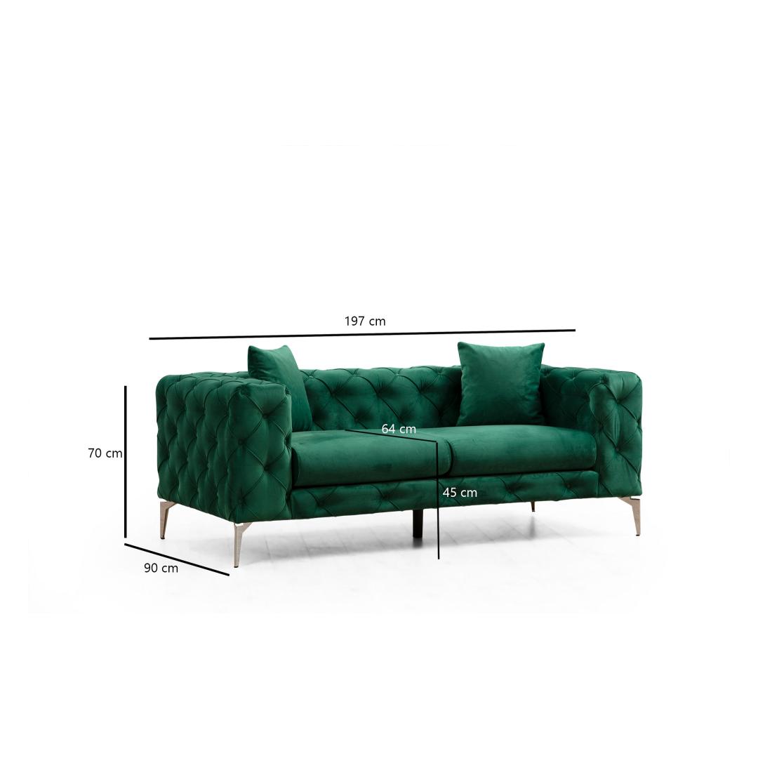 Koge ülimat mugavust ja stiili meie 2-istmelise rohelise diivaniga!Lõbutsege võrratu mugavusegaVajutage meie 2-istmelise diivani plüššpadjadesse ja kogege puhast õndsust. 5 cm 28 dns hall vahtpolster tagab erakordse toe, samas kui 5 cm 24 dns sulgedega lisab teie istumiskogemusele luksust. Ka seljapadi on täidetud 24 dns sulgedega, mis tagab maksimaalse mugavuse ja lõõgastumise.Tõstke oma elamispindaMeie 2-istmeline diivan lisab oma elegantse ja moodsa disainiga glamuuri igasse ruumi. Ühevärviline roheline värvus toob värskendavat ja elavat tunnet, muutes selle ideaalseks keskseks elemendiks teie elutuppa või magamistuppa. Kompaktne suurus 197 cm laius, 70 cm kõrgus ja 90 cm sügavus muudab selle ideaalseks väikestesse ruumidesse, ilma et see oleks stiili osas kompromissiks. Mugavus käeulatusesMeie 2-kohaline diivan on varustatud kahe padjaga, mis pakuvad lisatuge ja suurendavad üldist esteetilist atraktiivsust. Eemaldatav padjakate võimaldab lihtsat puhastamist, tagades, et teie diivan näeb alati värske ja kutsuv välja. Kuivpuhastatav kangas tagab pikaajalise vastupidavuse, mis teeb sellest praktilise valiku igapäevaseks kasutamiseks. Tehnilised üksikasjad:Raam: Puit: Pöögipuit / puitlaastplaatKangas: Materjal: 100% polüesterVaht: 5 cm 28 DNS hall vahtpolster, 5 cm 24 DNS sulega istumiseks, 24 DNS sulega seljatoeks.Padja suurus: 45 cm x 45 cmKaasaskantav istumispadiFikseeritud seljapadiJalad: Kroomitud metallist jaladVahu kõrgus: 16 cmJalgade kõrgus: 17 cmEemaldatav padjakateVärv: rohelineUuendage oma eluruumi meie 2-istmelise diivaniga ja kogege täiuslikku segu mugavusest, stiilist ja funktsionaalsusest. Tellige kohe ja muutke oma kodu lõõgastumise ja elegantsi paradiisiks. Värv: Green