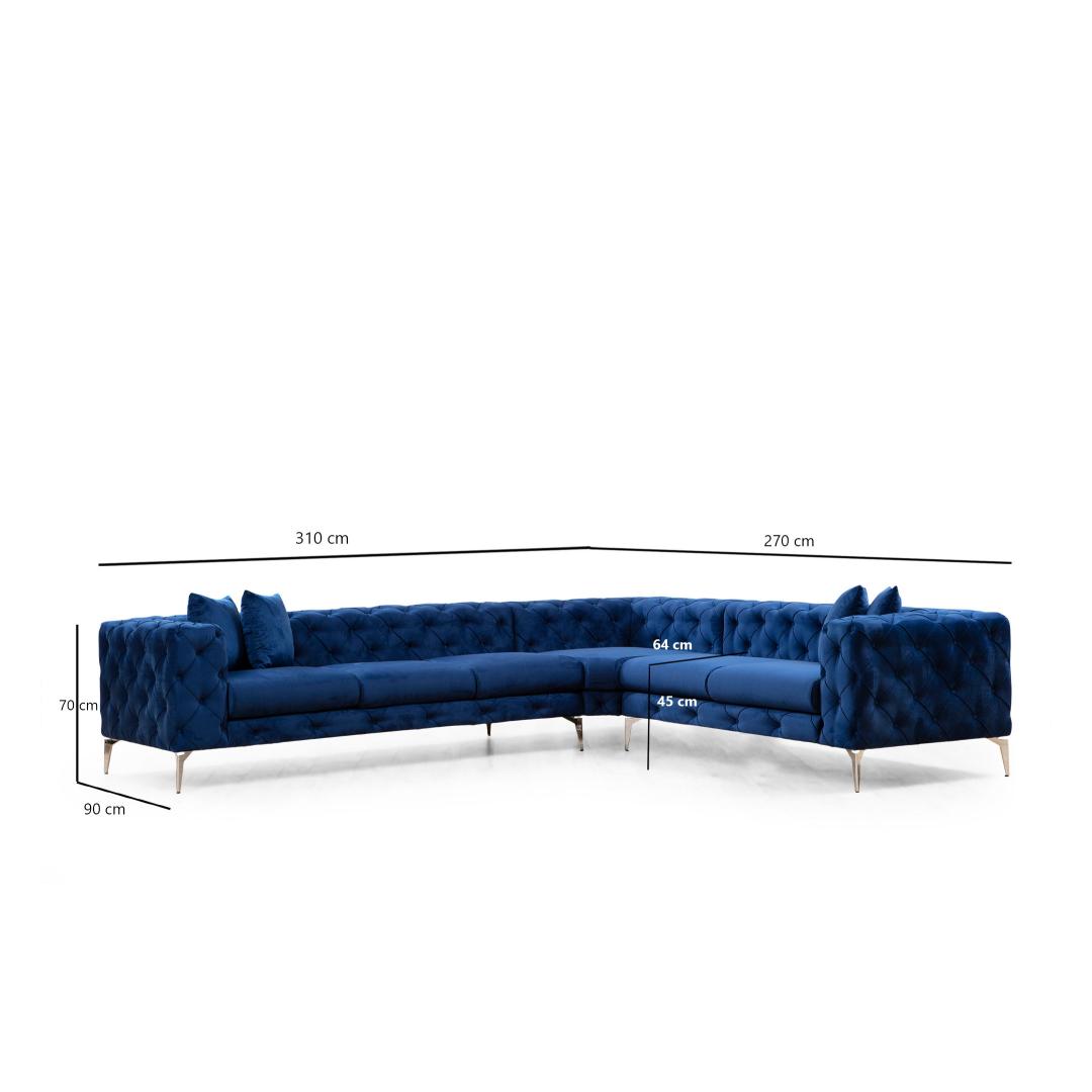 Tutvustame teile ülimat mugavust ja stiili meie nurgadiivaniga! muutke oma eluruum selle suurepärase mööbliesemega luksuslikuks paradiisiks. Võrratu mugavus ja tugiVajutage plüüsist padjadesse, mis on disainitud pakkuma optimaalset mugavust ja tuge. 5 cm 28 dns hall vahtpolster ja 5 cm 24 dns sulgedega istumiseks tagavad hubase ja lõõgastava elamuse. 24 dns sulg seljatoe jaoks lisab lisamugavust, mis võimaldab teil pärast pikka päeva lõõgastuda.Elegantne disainSelle elegantse ja moodsa disainiga nurgadiivan lisab vaevata glamuuri igasse ruumi. Tumesinine värvus õhkab rafineeritust, muutes selle teie eluruumi ideaalseks keskpunktiks. Metallist jalad lisavad kaasaegset hõngu, samas kui pöögipuidust ja puitlaastplaadist raam tagab vastupidavuse ja stabiilsuse. Muudatlik ja praktilineKaasaskantavad istumis- ja seljapadjad võimaldavad teil kohandada oma istumiskorraldust, mistõttu sobib see ideaalselt igaks juhuks. Eemaldatavad padjakatted muudavad puhastamise lihtsaks, tagades, et teie diivan näeb alati värske ja kutsuv välja. Kuivpuhastatav kangas lisab mugavust, muutes hoolduse lihtsaks. Tehnilised üksikasjad:Raam: Puit: Pöögipuit / puitlaastplaatKangas: Materjal: 100% polüesterLaius: 310 cm, kõrgus: 70 cm, sügavus: 270 cm.Vaht: 5 cm 28 DNS hall vaht + 5 cm 24 DNS sulega istumiseks, 24 DNS sulega seljatoele.6 padja, suurus: 45 cm x 45 cm, kaasa arvatud.% 60 % vahtpolster / % 40 % silikoonvaht.Jalad: Metallist jalad, jala kõrgus: 17 cmEemaldatav padjakateVärv: mereväe sinineKontseptsioon: Glam, Glam Värv: Navy Blue