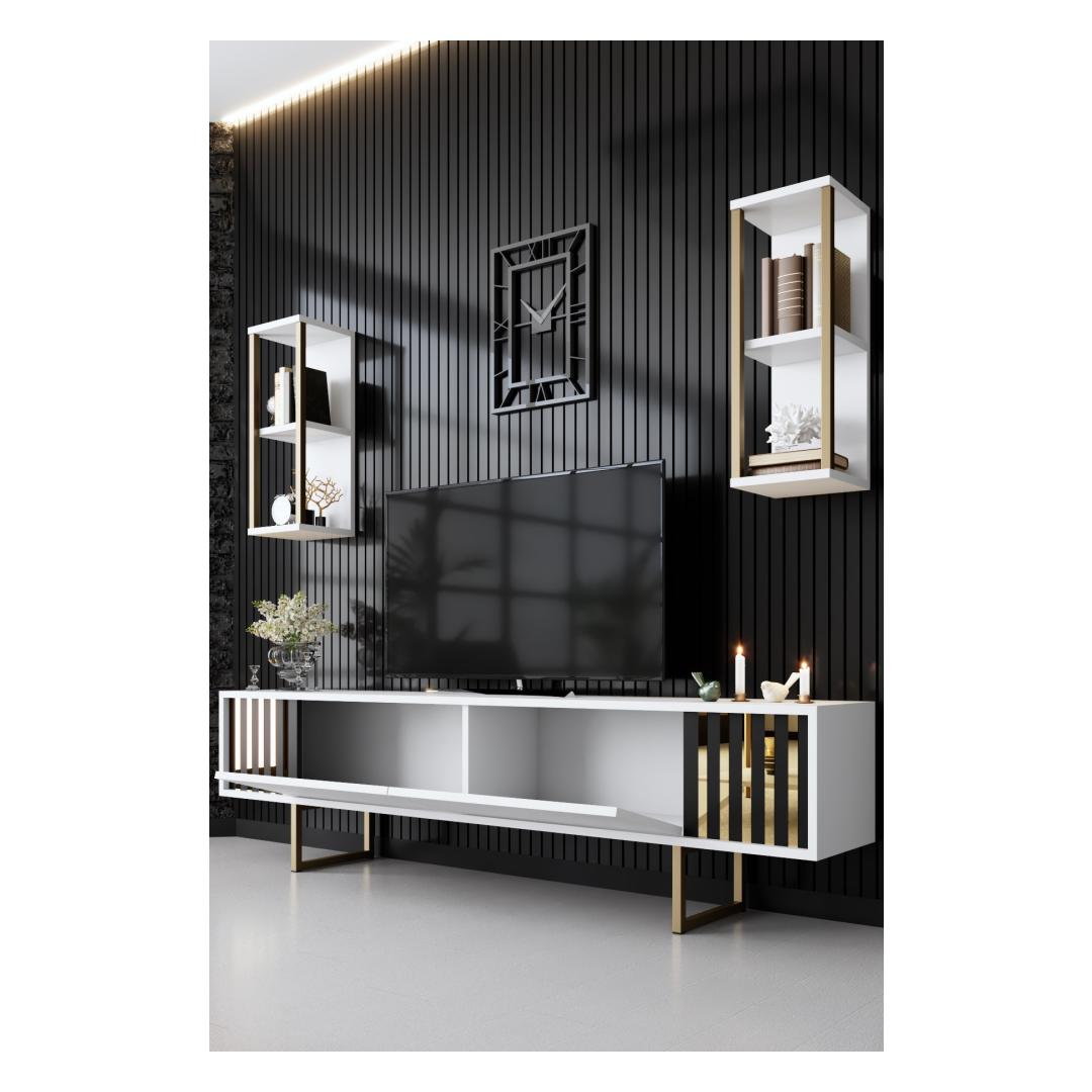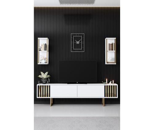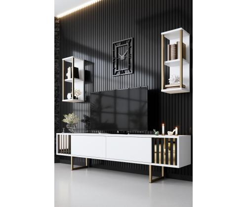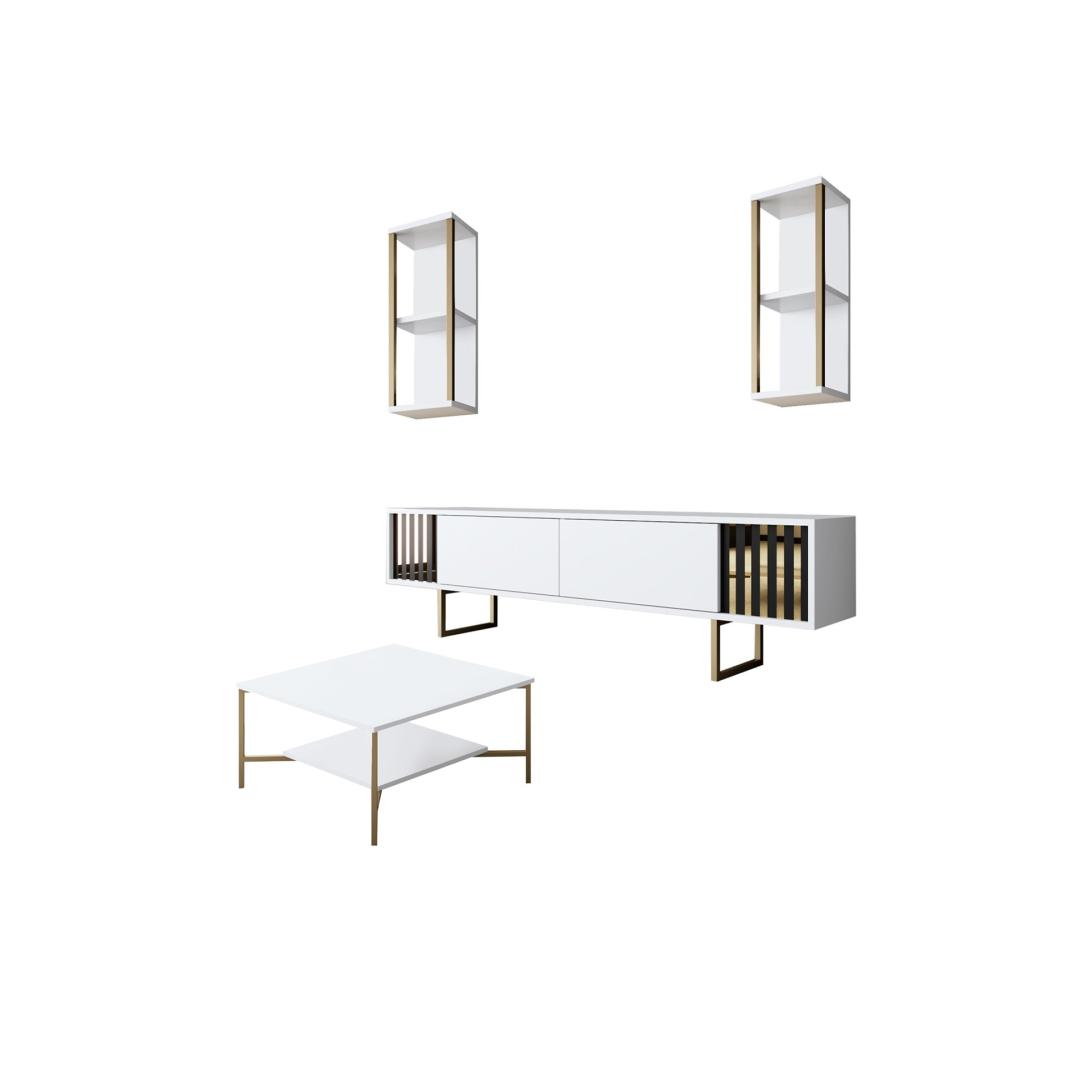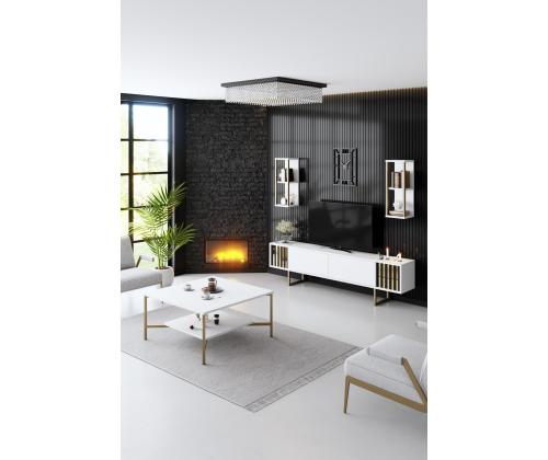Muuda oma elutuba elegantseks ja stiilipäraseks meie suurepärase elutoa mööblikomplektiga. See komplekt on valmistatud ülima hoole ja tähelepanuga detailidele ning on mõeldud teie ruumi kaunistamiseks ja luksuse tunde tekitamiseks. Päratu iluValge ja kuldse värvi kombinatsioon loob uimastava visuaalse kontrasti, mis lummab silmi koheselt. Stiilne ja moodne disain lisab igasse ruumi elegantsust, muutes selle teie eluruumi täiuslikuks keskpunktiks.Võrratu vastupidavusSee 100% melamiiniga kaetud puitlaastplaadist valmistatud mööblikomplekt on ehitatud nii, et see peab vastu. 18 mm paksus tagab erakordse tugevuse ja stabiilsuse, samal ajal kui metalljalad pakuvad täiendavat tuge ja vastupidavust. Monitoorne ja funktsionaalneSee komplekt pakub teleripuldi, seinariiulite ja kohvilaudadega rohkelt hoiu- ja väljapanekuvõimalusi kõigile teie hädavajalikele asjadele. Suuremõõtmelise laiuse ja sügavusega teleripult mahutab suuri ekraane, samas kui seinariiulid pakuvad stiilset lahendust teie lemmikdekoratsioonide esitlemiseks. Kohvilaud sobib ideaalselt külaliste vastuvõtmiseks või hubase õhtu nautimiseks lähedastega. Tehnilised üksikasjad:Materjal: Materjal: Materjal: Materjal: Materjal: Materjal: Materjal: Materjal: materjal: 100% melamiiniga kaetud puitlaastplaatPaksus: 18 mmMetallist jalad lisavad stabiilsustJalgade kõrgus: 18 cmMõõtmed:Teleri statiiv: Laius: 180 cm, sügavus: 30 cm, kõrgus: 48 cm.Seina riiul: Laius: 22 cm, sügavus: 21 cm, kõrgus: 60 cm (2 tk)Kohvilaud: Laius: 80 cm, sügavus: 80 cm, kõrgus: 40 cmElustage oma elutuba meie elutoa mööblikomplektiga ja kogege täiuslikku segu stiilist, funktsionaalsusest ja vastupidavusest. Uuendage oma ruumi juba täna ja andke endale väärilist luksust. Värv: White Gold
