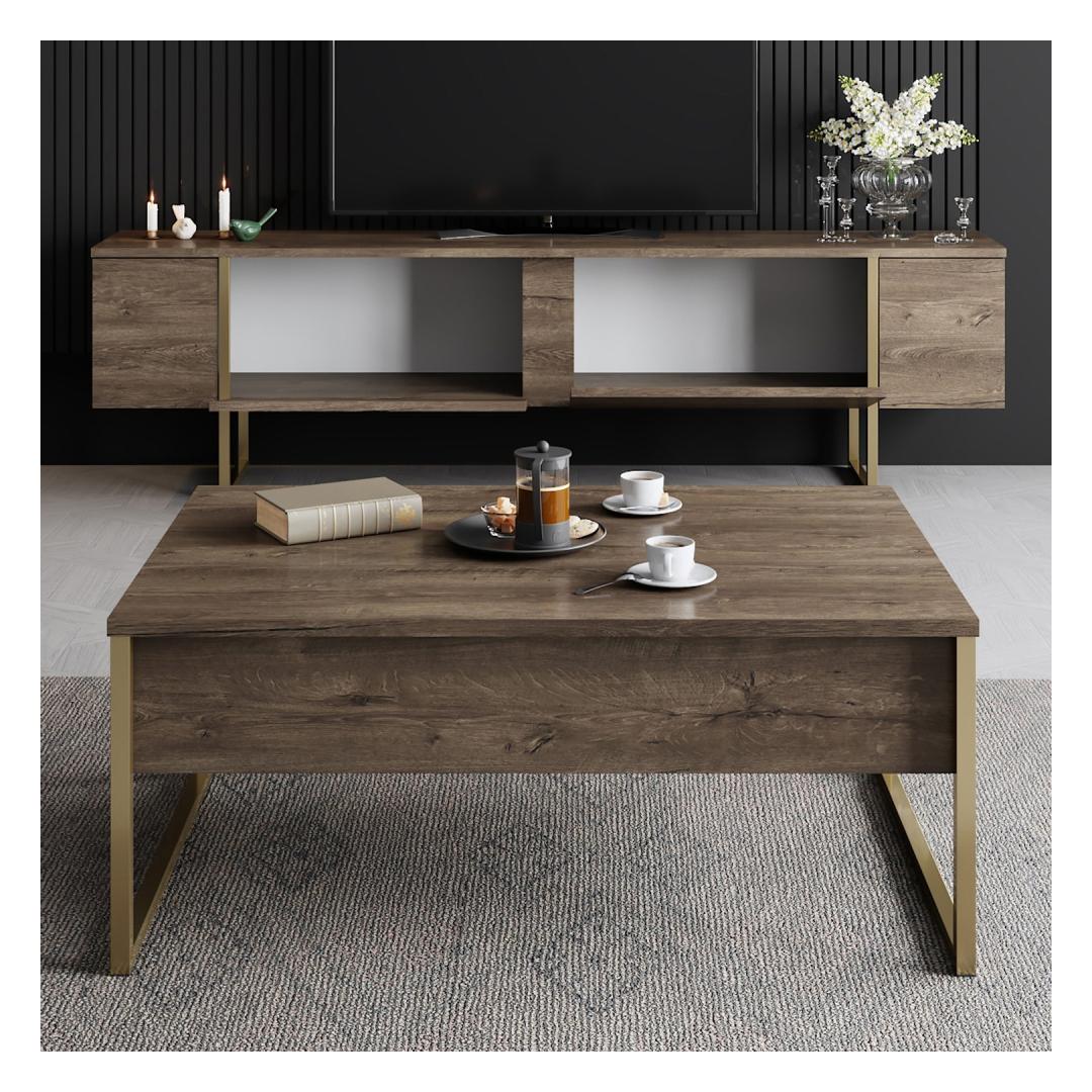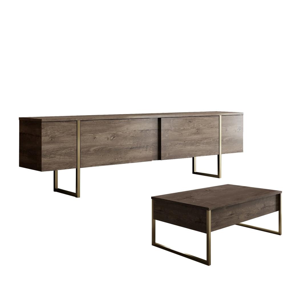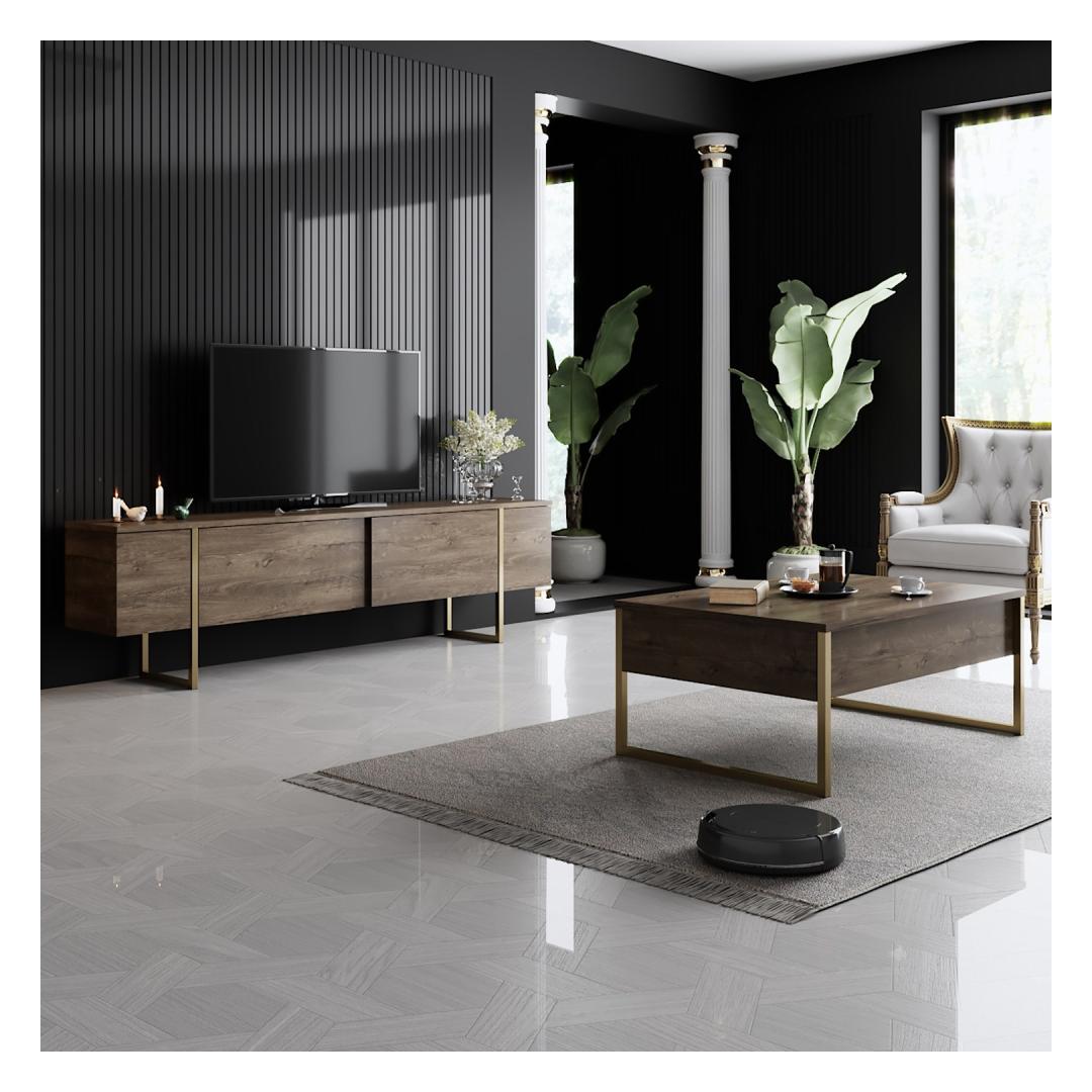 Muuda oma elutuba luksuslikuks ja elegantseks ruumiks meie hämmastava elutoa mööbliseeriaga. Valmistatud 100% melamiinkattega puitlaastplaadist, on see seeria mitte ainult vastupidav, vaid kiirgab ka rafineeritust, mis tõstab teie kodu sisustuse uuele tasemele.Tõsta oma eluruumiPähkli ja kuldse värvi kombinatsioon lisab teie elutuppa luksuslikkuse, luues sooja ja kutsuva atmosfääri, kus teie ja teie külalised saavad nautida. TV-aluse ja kohvilaudade sujuv disain tõstab koheselt teie ruumi välimust, muutes selle igas toas keskpunktiks.Kvaliteetne käsitööValmistatud 18 mm paksusest puitlaastplaadist ja PVC-jalgadest, on see mööbliseeria loodud kestma aastaid. 15 cm jalgade kõrgus tagab stabiilsuse ja toe, kindlustades, et teie mööbel jääb alati kindlaks ja turvaliseks.Tehnilised andmed:Materjal: 100% melamiinkattega puitlaastplaatPaksus: 18 mmJalad: PVC jaladJalgade kõrgus: 15 cmTV-aluse mõõtmed: Laius: 180 cm, Sügavus: 30 cm, Kõrgus: 47 cmKohvilaudade mõõtmed: Laius: 90 cm, Sügavus: 39 cm, Kõrgus: 40 cmVärv: Pähkel ja kuld Värv: Walnut Gold