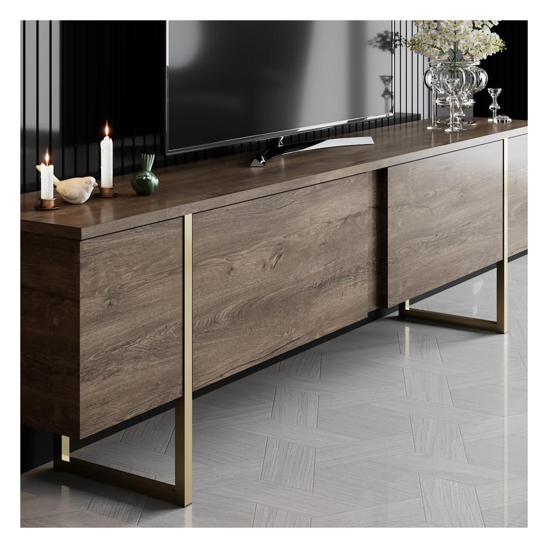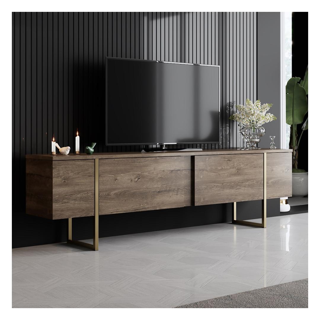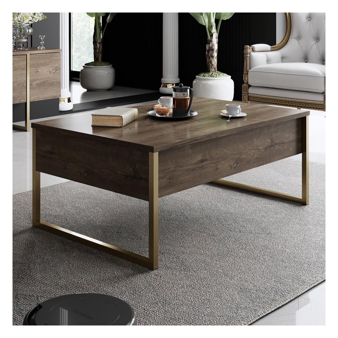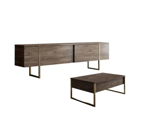 Muuda oma elutuba luksuslikuks ja elegantseks ruumiks meie hämmastava elutoa mööbliseeriaga. Valmistatud 100% melamiinkattega puitlaastplaadist, on see seeria mitte ainult vastupidav, vaid kiirgab ka rafineeritust, mis tõstab teie kodu sisustuse uuele tasemele.Tõsta oma eluruumiPähkli ja kuldse värvi kombinatsioon lisab teie elutuppa luksuslikkuse, luues sooja ja kutsuva atmosfääri, kus teie ja teie külalised saavad nautida. TV-aluse ja kohvilaudade sujuv disain tõstab koheselt teie ruumi välimust, muutes selle igas toas keskpunktiks.Kvaliteetne käsitööValmistatud 18 mm paksusest puitlaastplaadist ja PVC-jalgadest, on see mööbliseeria loodud kestma aastaid. 15 cm jalgade kõrgus tagab stabiilsuse ja toe, kindlustades, et teie mööbel jääb alati kindlaks ja turvaliseks.Tehnilised andmed:Materjal: 100% melamiinkattega puitlaastplaatPaksus: 18 mmJalad: PVC jaladJalgade kõrgus: 15 cmTV-aluse mõõtmed: Laius: 180 cm, Sügavus: 30 cm, Kõrgus: 47 cmKohvilaudade mõõtmed: Laius: 90 cm, Sügavus: 39 cm, Kõrgus: 40 cmVärv: Pähkel ja kuld Värv: Walnut Gold