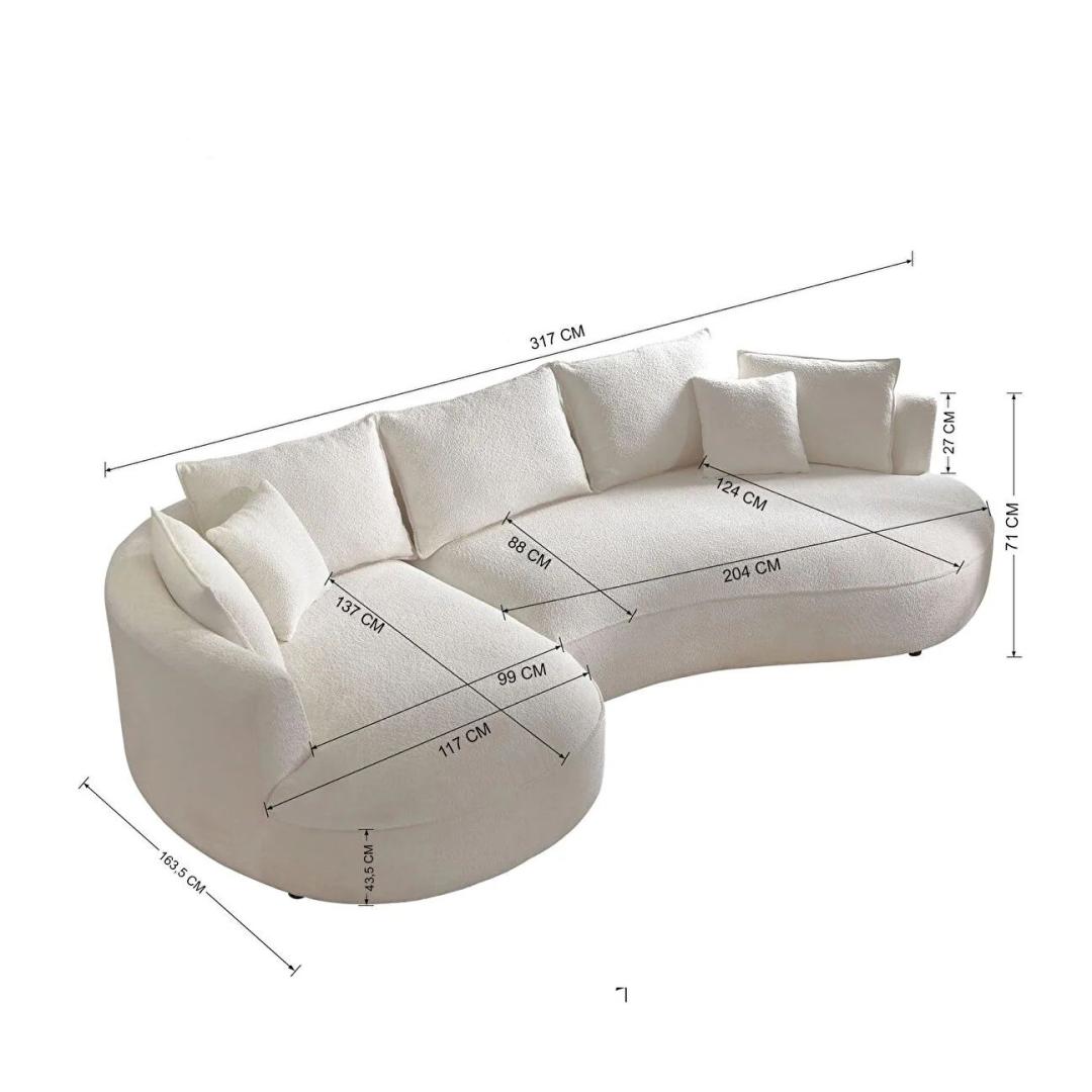 Muuda oma eluruum luksusliku ja stiilse nurgadiivaniga. See hämmastav mööbliese tõstab mitte ainult sinu kodu välimust, vaid pakub ka maksimaalset mugavust ja lõõgastust, mida sa väärid.Ükski mugavus ja stiil ei ole võrreldavadValmistatud HORNBEAM'i ja MELAMIINI KAETUD KIPSPLAADI raamiga, on see diivan mitte ainult vastupidav, vaid kiirgab ka elegantsi. 100% POLÜESTER kangas Boucle tekstuuriga lisab sinu ruumile peenust. 30 DNS vahtmaterjal tagab pehme ja mugava istumiskogemuse, samas kui kaasaskantav seljapadi võimaldab sul oma mugavust kohandada.Kergesti hooldatav ja mitmekülgneSelle diivani lihtne puhastamine muudab selle praktiliseks valikuks kiire elustiiliga peredele. Plastjalad pakuvad stabiilsust ja tuge, samas kui 7 kaasasolevat patja lisavad sinu istumispaigale hubasust. 240 kg kandevõimega on see diivan ideaalne koosolekute korraldamiseks või lihtsalt lähedastega lõõgastumiseks.Mõõtmed ja värv317 cm laiuse, 71 cm kõrguse ja 163,5 cm sügavusega pakub see diivan piisavalt istumiskohta sinu perele ja külalistele. Valge värv lisab sinu elutuppa modernset ja šikki atmosfääri, muutes selle sinu kaunistuse keskpunktiks.Tehnilised andmed:Raam: 70% HORNBEAM / 30% MELAMIINI KAETUD KIPSPLAATKangas: 100% POLÜESTER (Boucle tekstuur)PlastjaladKergesti puhastatavKaasaskantav seljapadi30 DNS vahtmaterjalVahtmaterjali kõrgus: 20 cm7 patja on kaasasLaius: 317 cm Kõrgus: 71 cm Sügavus: 163,5 cmIstu kõrgus: 43,5 cmIstu sügavus: 137 cmKäetoe kõrgus: 71 cmJala kõrgus: 1,5 cmKandevõime: 240 kgVärv: Valge Värv: White
