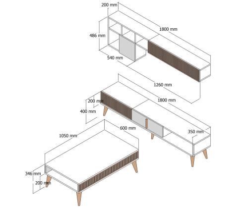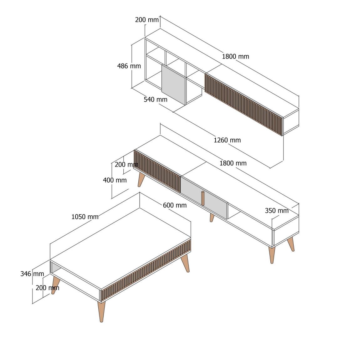 The TV stand, with its generous width of 180 cm, provides ample space for your entertainment essentials. The wall shelf, measuring 180 cm in width, adds a touch of elegance to your room while offering convenient storage. The coffee table, with its perfect dimensions of 105 cm width and 60 cm depth, is ideal for hosting gatherings or simply enjoying a cozy evening with loved ones.