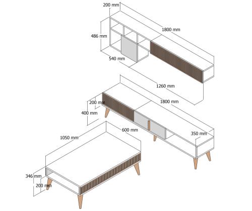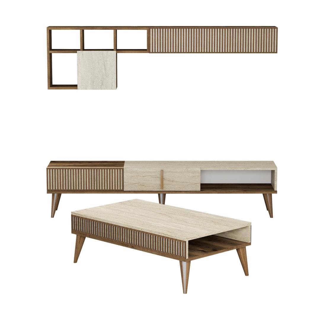 The TV stand, wall shelf, and coffee table included in this set are designed to enhance the aesthetic of your living room. The sleek design and walnut and travertine colors add a touch of modernity to any space, while the marble concept brings a sense of opulence.