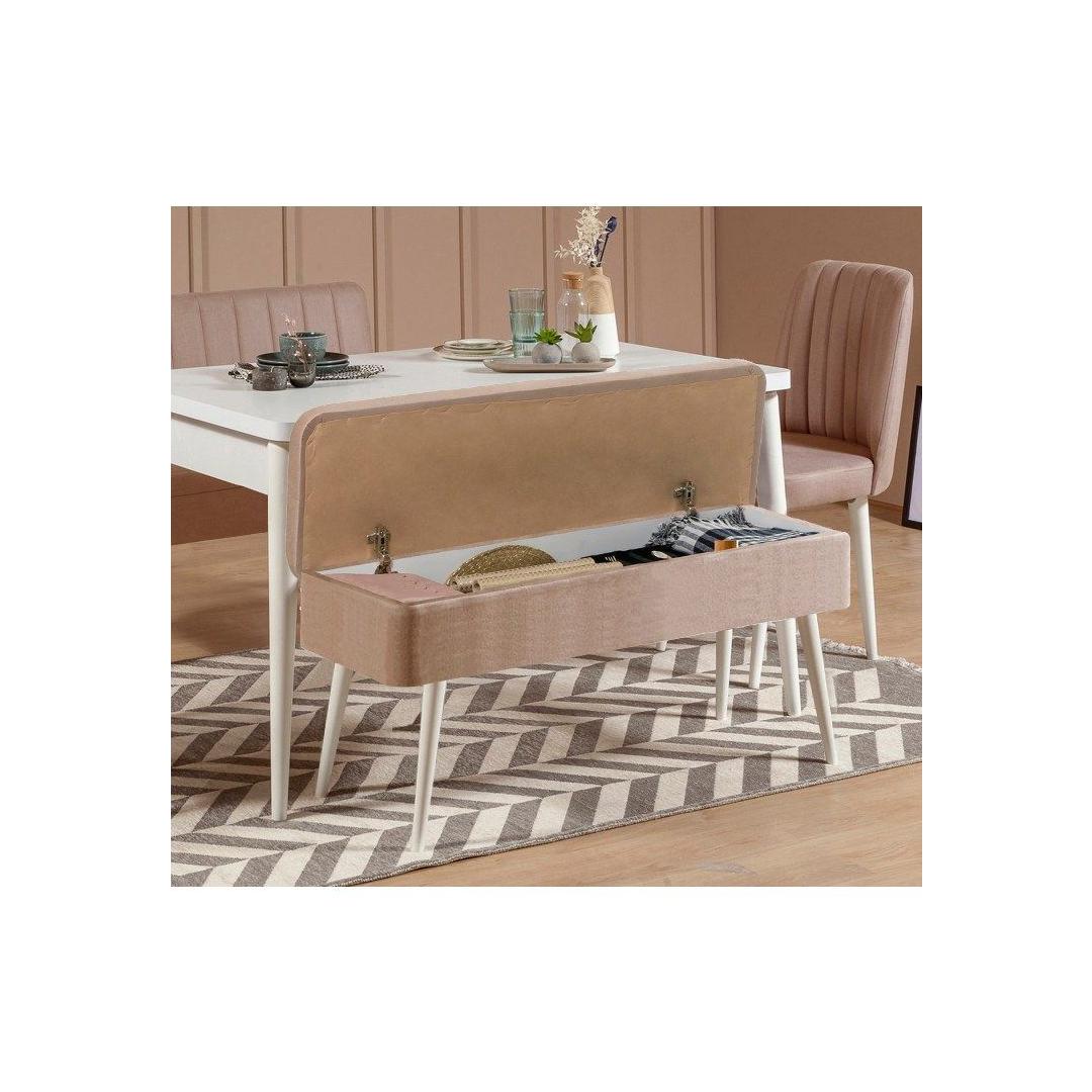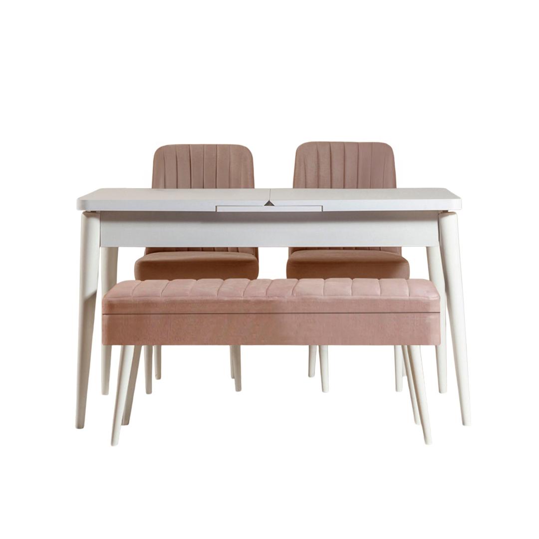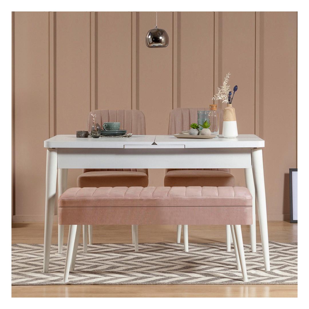 Loo püsivaid mälestusi elegantse ja mitmekülgse pikendatava söögilaua ja toolide komplektigaMuutke oma söögituba ruumiks, kus luuakse väärtuslikke mälestusi meie suurepärase pikendatava söögilaua ja toolide komplektiga. See komplekt on valmistatud ülima täpsuse ja tähelepanelikkusega, et tõsta teie söögikogemus uutesse kõrgustesse.Võrratu elegants ja vastupidavus100% melamiiniga kaetud puitlaastplaadist valmistatud söögilaua ja toolide komplekt väljendab ajatut elegantsi, tagades samas pikaajalise vastupidavuse. Sileda ja elegantse pinnaga laud lisab igasse ruumi rafineeritust, muutes selle ideaalseks perekondlike koosviibimiste ja õhtusöögi pidude keskpunktiks. Monitoorne ja laiendatavTänu pikendatavale disainile kohandub meie söögilaud vaevata teie vajadustele. Olenemata sellest, kas korraldate intiimset õhtusööki kahele või suuremat koosviibimist, avage laud lihtsalt täissuuruseks ja kõik mahuvad mugavalt ära. Komplekti kuuluvad ka kaks tooli ja pink, mis pakuvad külalistele piisavalt istumisvõimalusi. Luksuslik mugavusNautige ülimat söögikogemust meie 100% sametkangaga polsterdatud toolidega. Pehmed padjad ja ergonoomiline disain tagavad maksimaalse mugavuse, mis võimaldab teil lõõgastuda ja nautida oma sööki stiilselt. Tehnilised üksikasjad:Söögilaua suurus: Laius: 129 cm, kõrgus: 75 cm, sügavus: 80 cm (1 tk).Avatud laua suurus: Laius: 163 cm, kõrgus: 75 cm, sügavus: 80 cm. Laius: 47 cm, kõrgus: 90 cm, sügavus: 45 cm (2 tk)Istme kõrgus: 45 cmPinki suurus: Laius: 110 cm, kõrgus: 50 cm, sügavus: 40 cm (1 tk)Kangas: 100% sametVärvid: Valge ja kivi Värv: White Stone