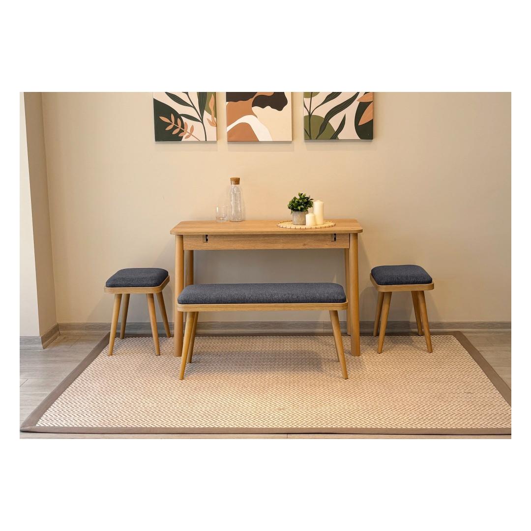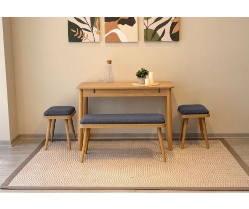 Muuda oma söögituba stiilseks ja funktsionaalseks ruumiks meie pikendatava söögilaua ja toolide komplektiga. See 4-osaline komplekt on ideaalne peresöömingute korraldamiseks või külaliste meelelahutamiseks.Elegantne disainSöögilaua ja toolide komplekti sujuv disain lisab igale ruumile elegantsi. Tamme ja antratsiidi värvid sulanduvad sujuvalt igasse sisustustiili, muutes selle mitmekülgseks lisandiks teie koju.RuumisäästlikPikendatava söögilaua abil saate vajadusel hõlpsasti rohkem külalisi mahutada, ilma et see võtaks teie söögialas lisaruumi. Jalatoolid ja pink pakuvad täiendavaid istekohti, ilma et ruum oleks ülekoormatud.Kestlik konstruktsioonValmistatud 100% melamiinkattega puitlaastplaadist, on see söögikomplekt loodud kestma. 18 mm paksus tagab stabiilsuse ja vastupidavuse igapäevaseks kasutamiseks.Tehnilised andmed:Materjal: 100% melamiinkattega puitlaastplaatPaksus: 18 mmSöögilaud: Laius: 110 cm, Kõrgus: 75 cm, Sügavus: 50 cm (1 tk)Ava laua suurus: Laius: 110 cm, Kõrgus: 75 cm, Sügavus: 70 cmJalatool: Laius: 40 cm, Kõrgus: 46 cm, Sügavus: 33 cm (2 tk)Jalatooli jala kõrgus: 38 cmPink: Laius: 90 cm, Kõrgus: 46 cm, Sügavus: 33 cm (1 tk)Pingi jala kõrgus: 38 cmVärv: Tamm ja antratsiitUuenda oma söögikogemust meie pikendatava söögilaua ja toolide komplektiga juba täna. Muuda iga eine eriliseks sündmuseks selle mitmekülgse ja stiilse komplektiga. Värv: Oak Anthracite
