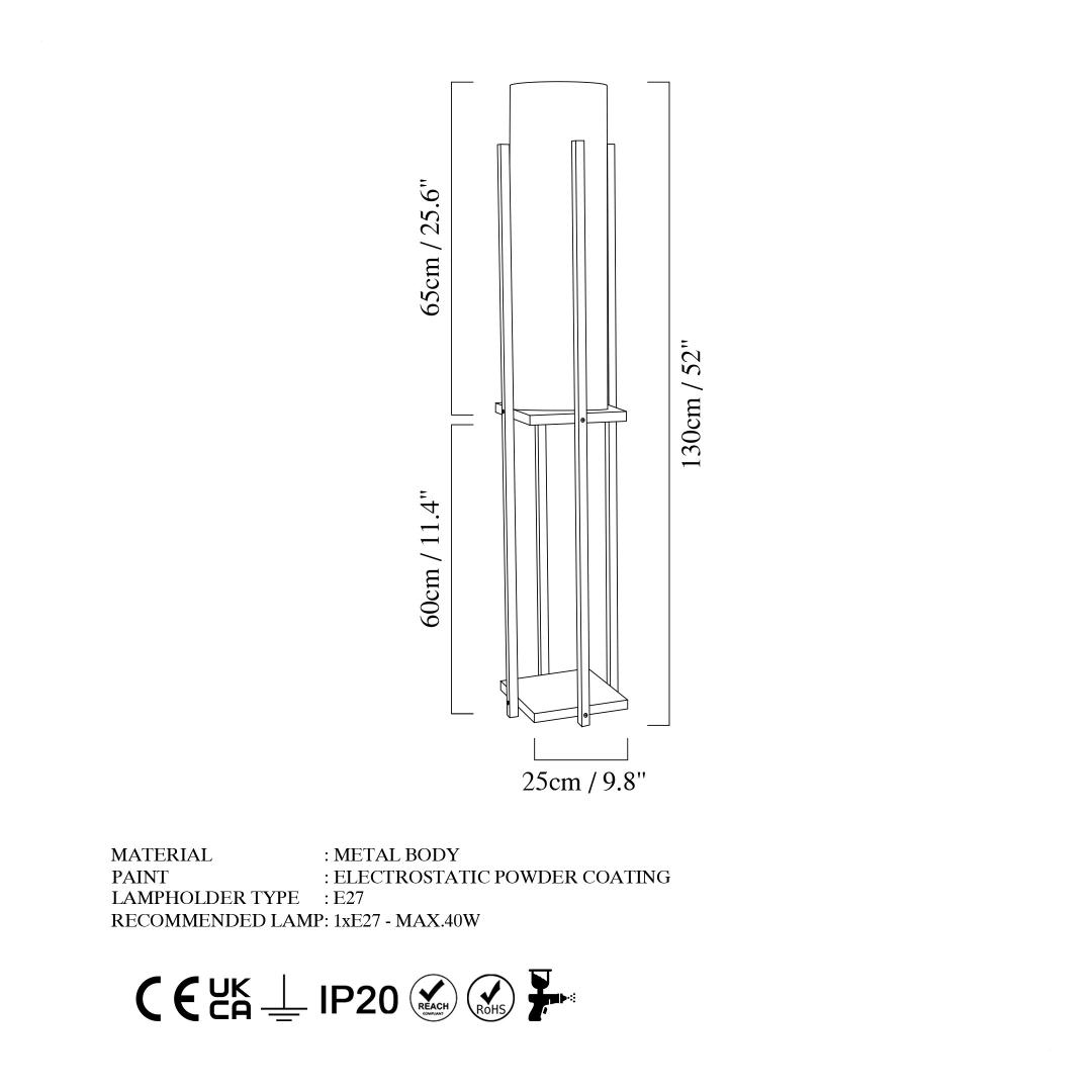 With a width and depth of 25 cm and a height of 130 cm, this floor lamp is the perfect size to fit seamlessly into any corner or nook. The cap's diameter of 20 cm and height of 65 cm ensures that the light is distributed evenly, illuminating your space with a gentle and soothing glow.