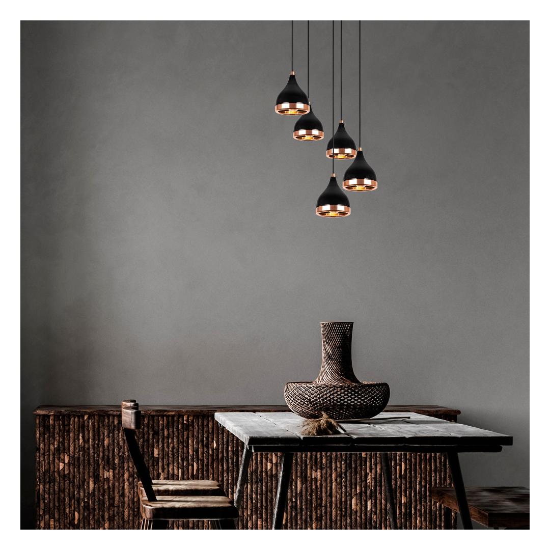 The contrasting colors of black and copper add a touch of elegance and style to this chandelier. The sleek black finish complements any interior design, while the copper accents add a subtle hint of luxury. This combination creates a visually striking piece that will effortlessly enhance the overall aesthetic of your space.