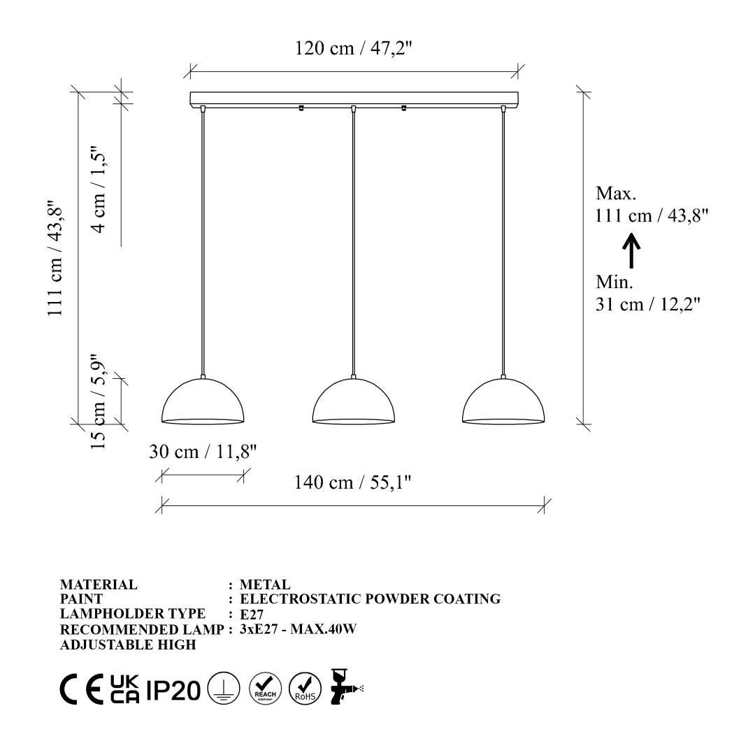 - Socket Type: 3 x E 27 Max 40 W