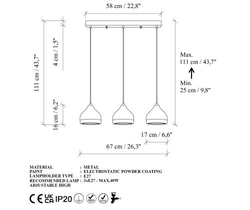 - Socket Type: 3 x E 27 Max 40 W