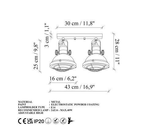 - Socket Type: 2 x E 14 Max 40 W