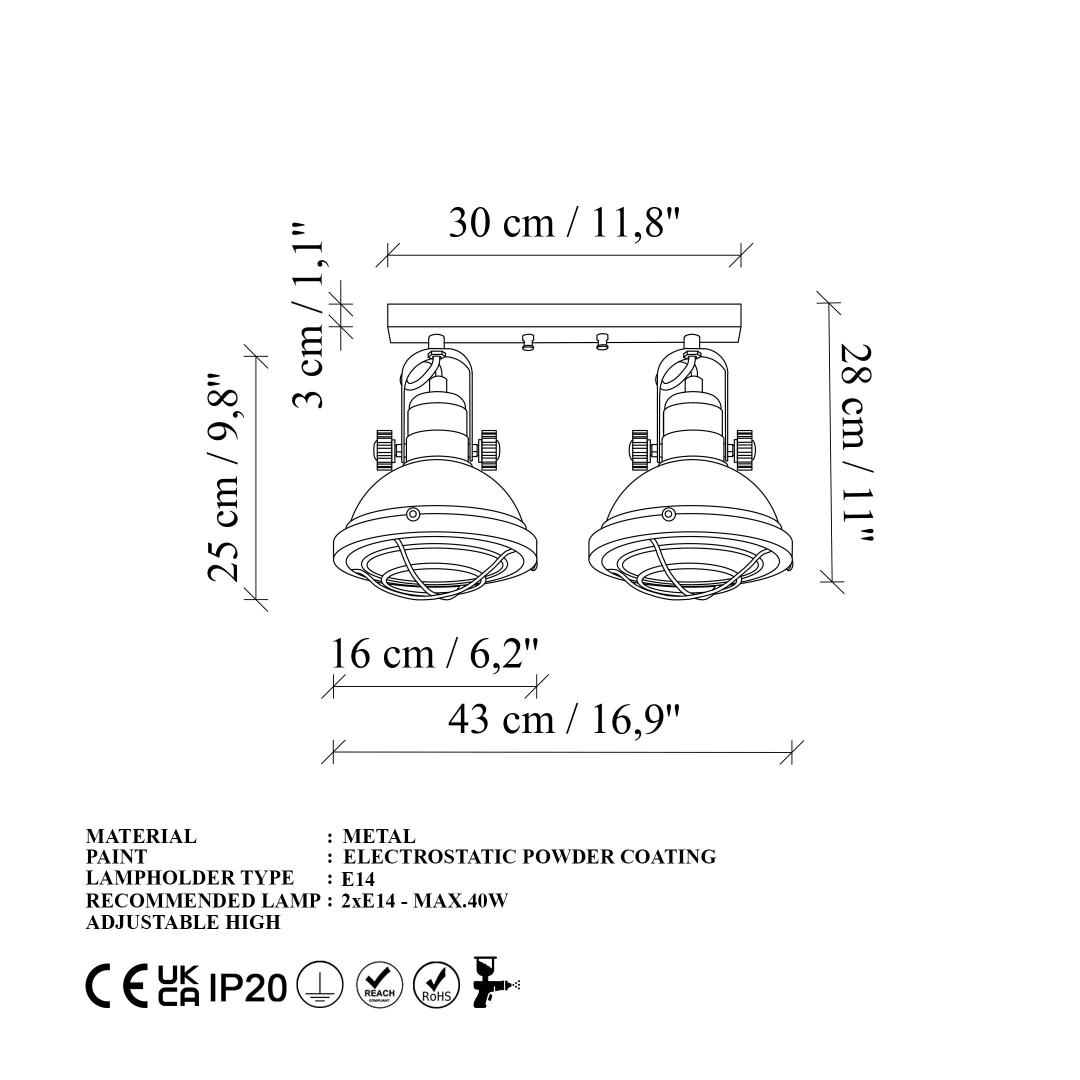 With two E14 sockets that can accommodate bulbs up to 40W each (bulbs not included), this chandelier will provide ample light to brighten up your space and create a cozy ambiance. The size of 43 x 16 x 25 cm makes it the perfect size for most rooms, while the IP20 rating ensures safety and durability.