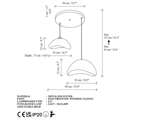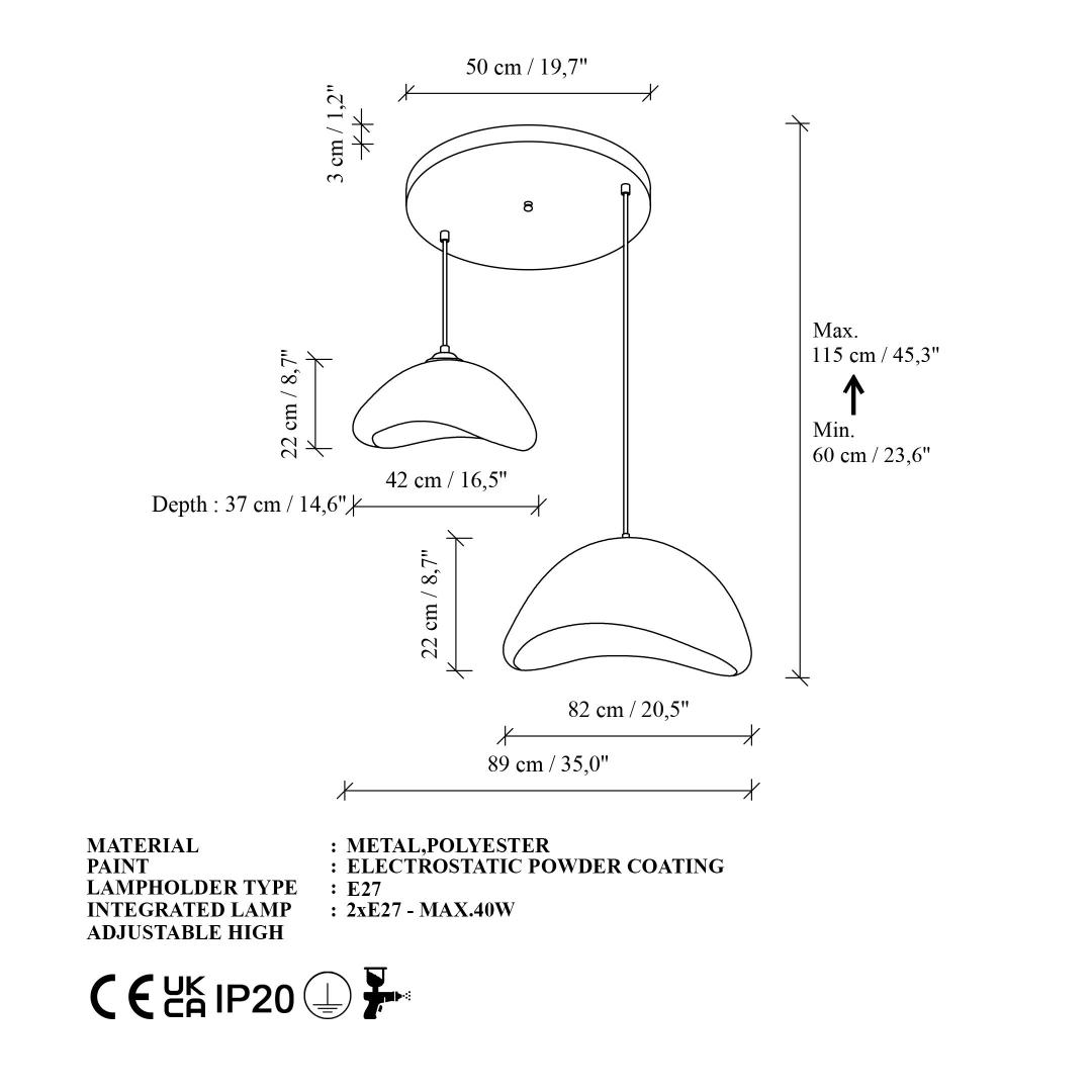 Illuminate your space with elegance and style with our stunning chandelier. This exquisite piece features a sleek metal body and a fiberglass cap, adding a touch of sophistication to any room. The small cap size of 42 x 37 x 22 cm and the big cap size of 52 x 40 x 26 cm create a beautiful balance in design, while the total height of 60 - 115 cm allows for versatile placement options.