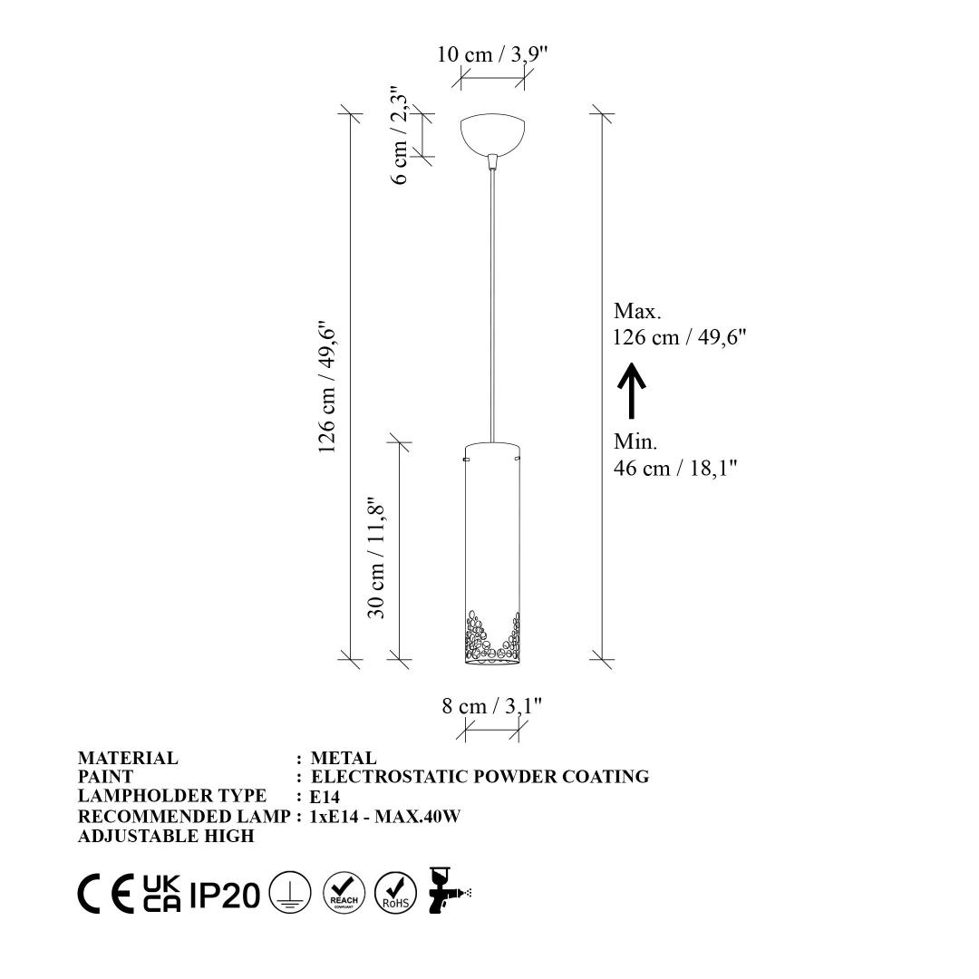 With its impressive size of 8 x 8 x 126 cm, this chandelier is sure to make a statement in your home. The metal cap measures Ø8 h:30 cm, adding a touch of grandeur to the overall design. The base plate size of Ø10 h:6 cm ensures stability and durability for years to come.