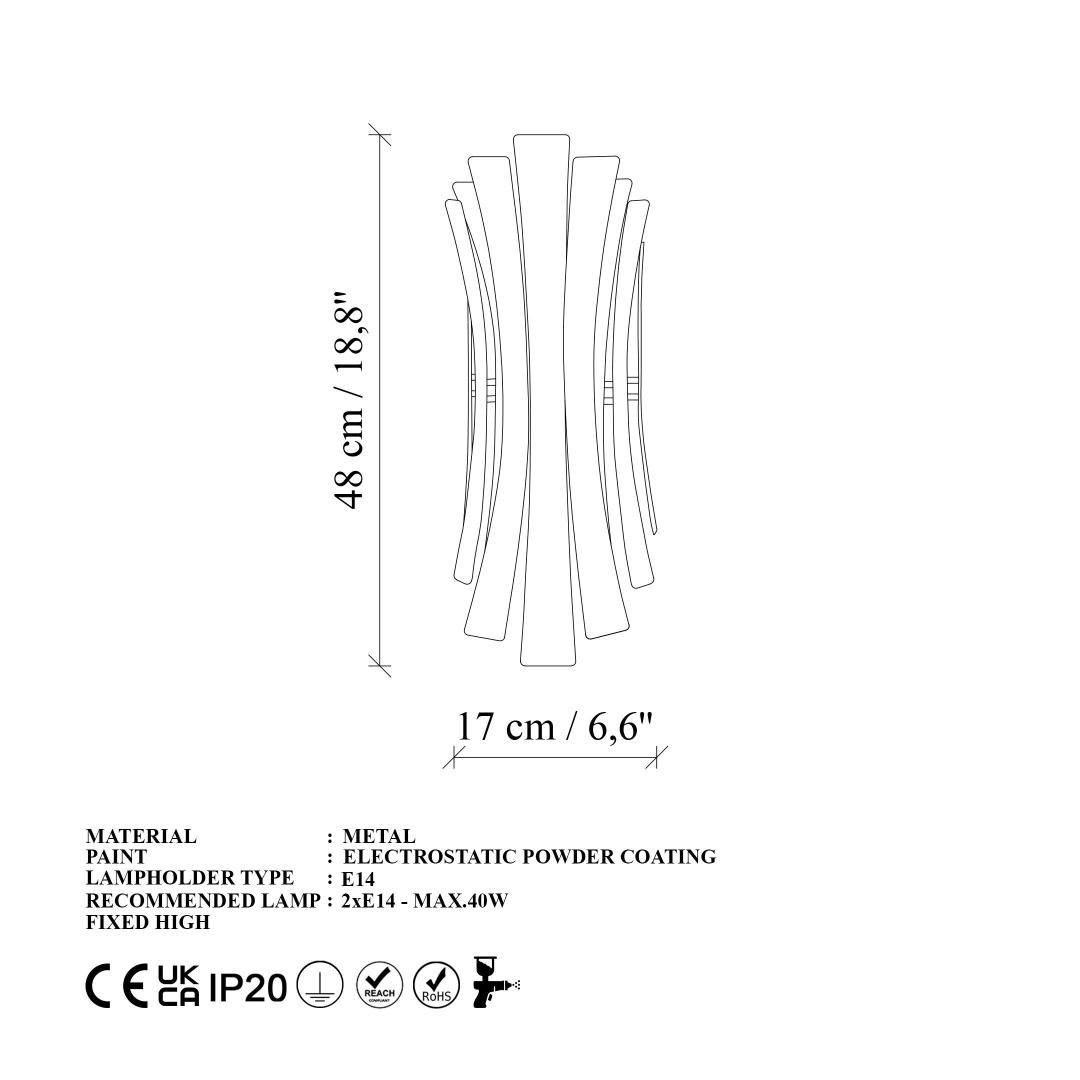 With a size of 17 x 16 x 48 cm and a base plate size of 18 x 14 x 1 cm, this wall lamp is easy to install and will fit seamlessly into any space. The 220-240 V socket type allows for easy connection, and the IP20 rating ensures safety and durability.
