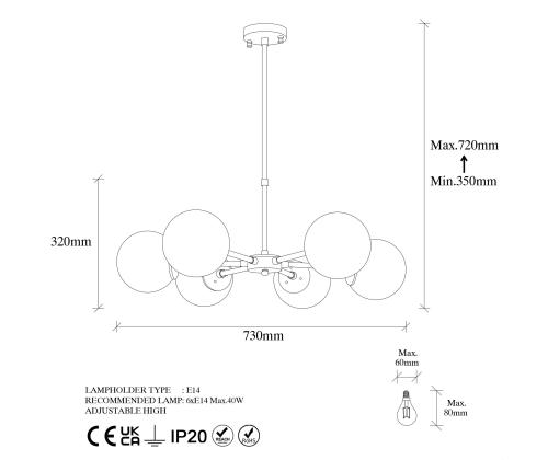 - Socket Type: 6 x E14 Max 40 W