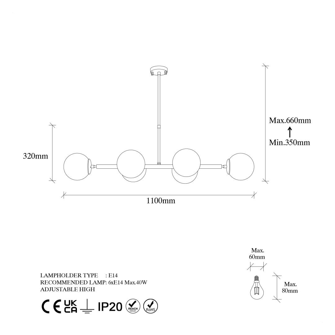 - Socket Type: 6 x E14 Max 40 W