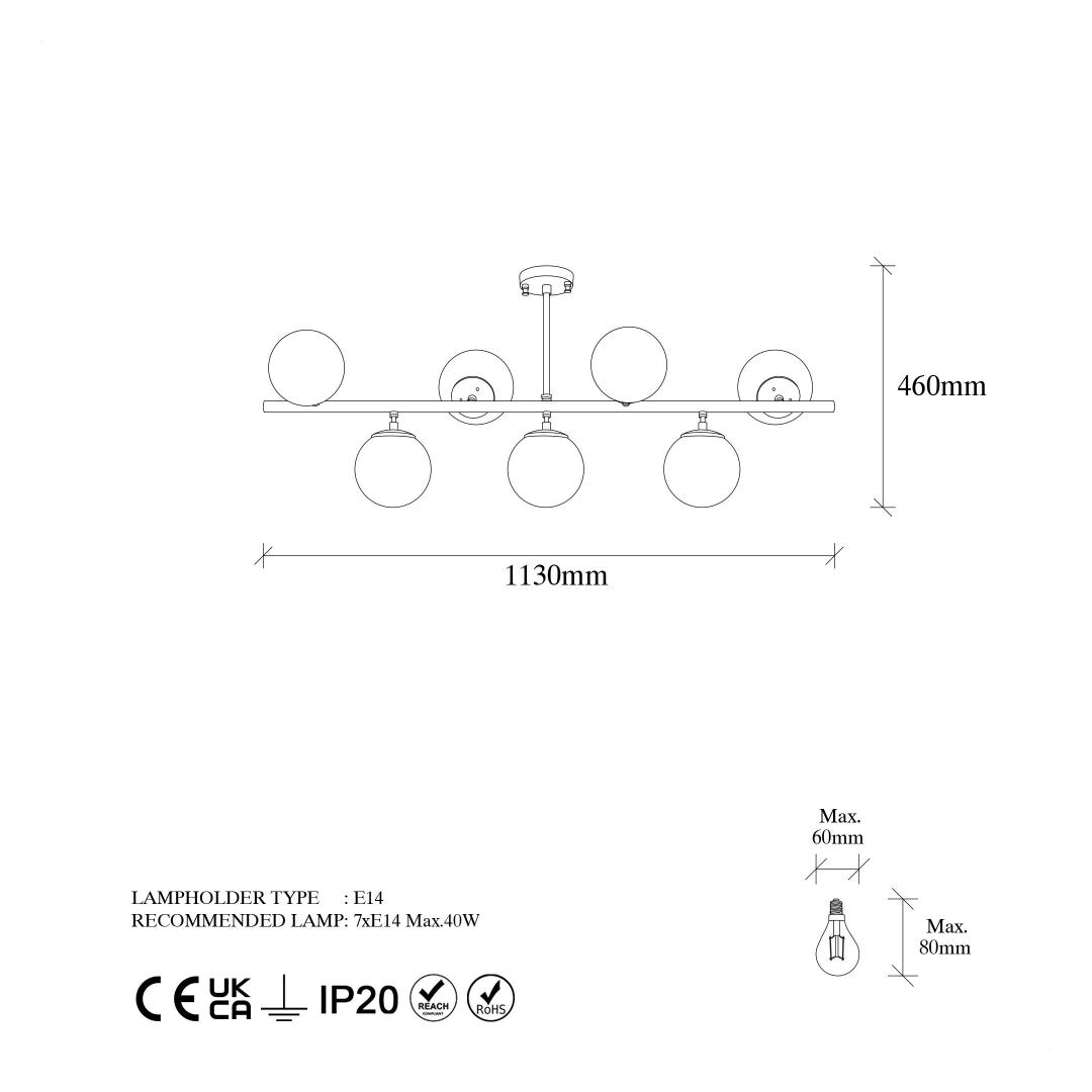 Illuminate your space with the soft and warm glow emitted by the seven E14 bulbs. The chandelier's size of 113 x 40 x 46 cm makes it the perfect focal point for any room, whether it's your dining area, living room, or bedroom.