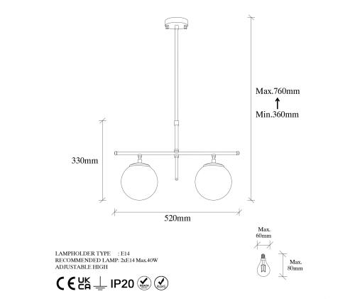 - Socket Type: 2 x E 14 Max 40 W