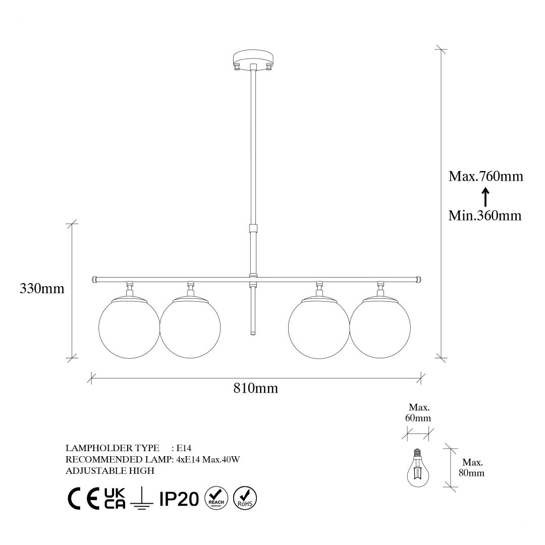 With four E14 sockets, this chandelier provides ample lighting to brighten up any room in your home. The on/off button on the cable makes it easy to control the lighting, while the IP20 rating ensures safety and peace of mind.