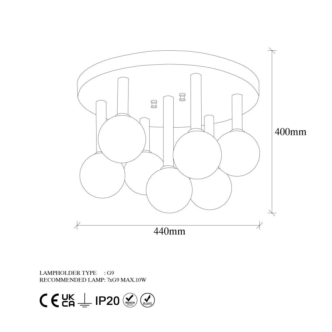 With a size of 44 x 44 x 40 cm and a cap diameter of 10 cm, this chandelier is the perfect size for medium to large rooms. The 7 x G9 socket type allows for a maximum of 8W bulbs (not included), providing ample lighting for any occasion. The IP20 rating ensures durability and safety, while the 220-240V voltage ensures compatibility with most electrical systems. Don't miss out on the opportunity to transform your space with our Metal Body Chandelier. Order yours today!