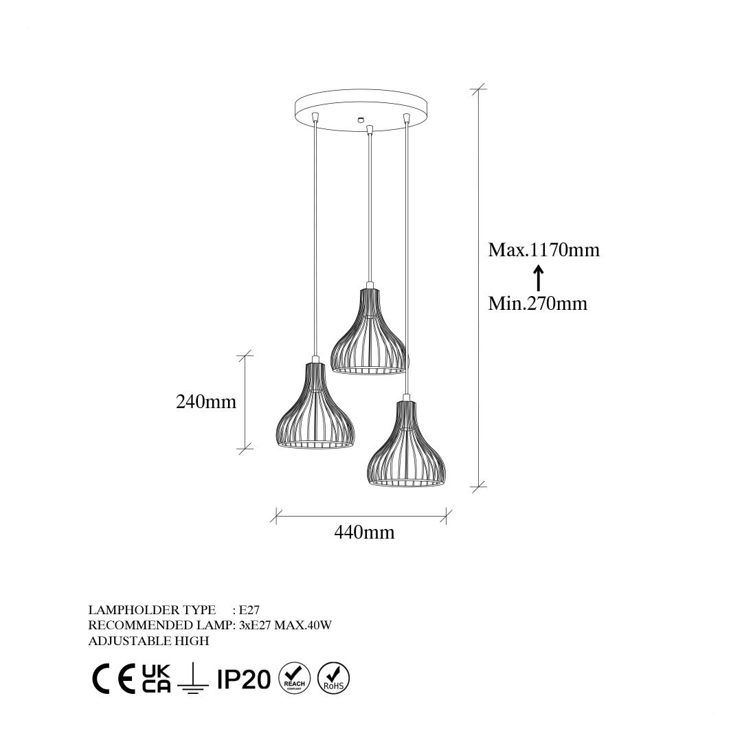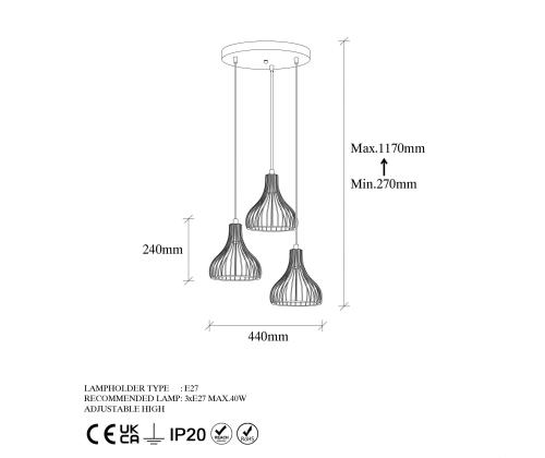 - Socket Type: 3 x E27 Max 40W bulbs (not included)