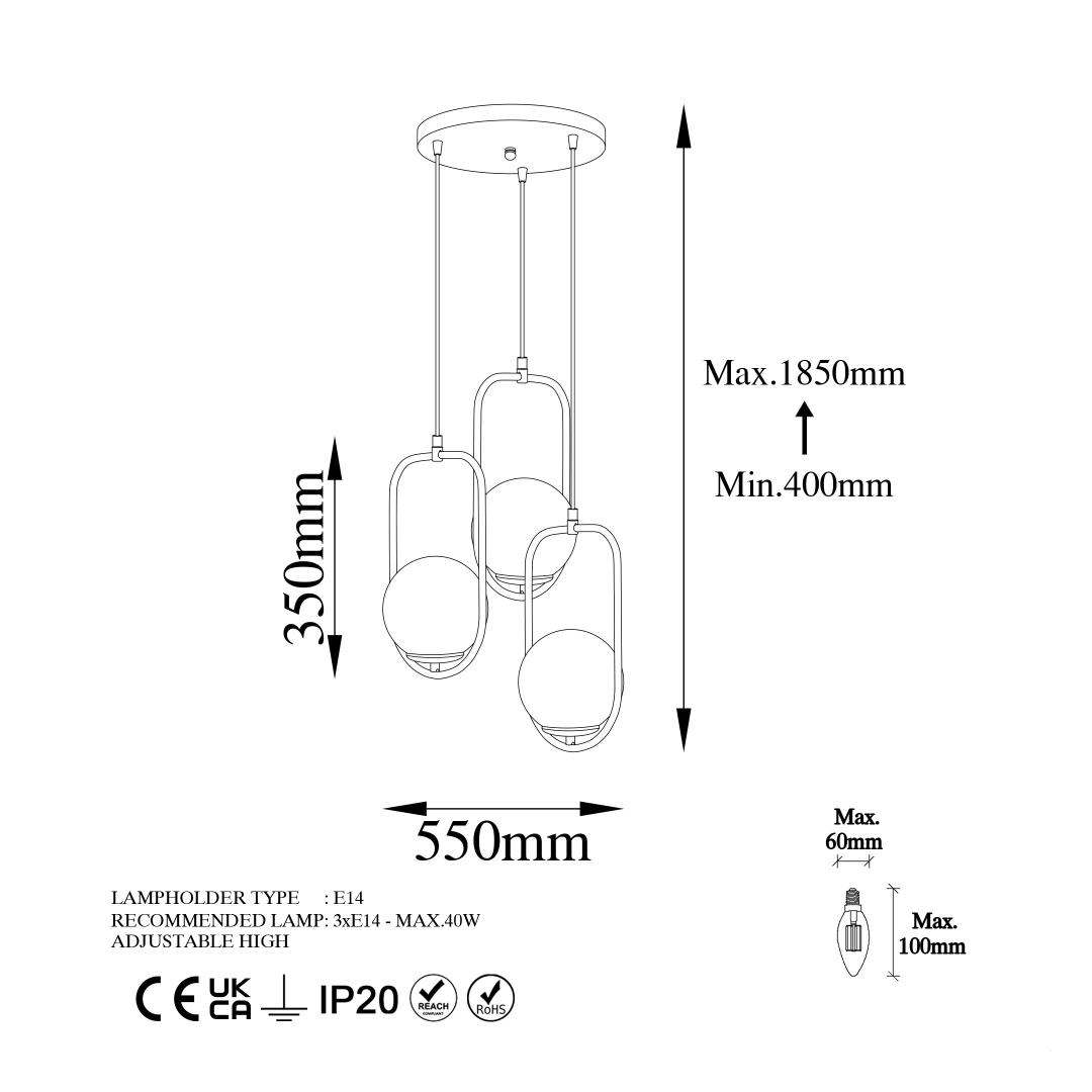 - Equipped with 3 x E14 sockets, accommodating bulbs with a maximum wattage of 40 W