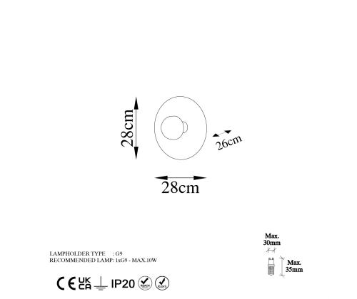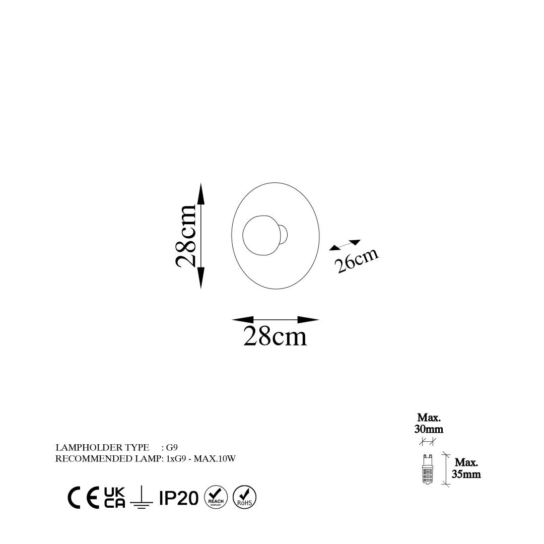 With a diameter of 28 cm and a height of 26 cm, this wall lamp is the perfect size for any wall. The base plate has a diameter of 10 cm and a height of 3 cm, making it easy to install and use in any room. The socket type is 1 x G 9 Max 8 W, providing plenty of light for your space.