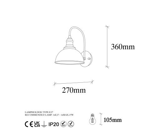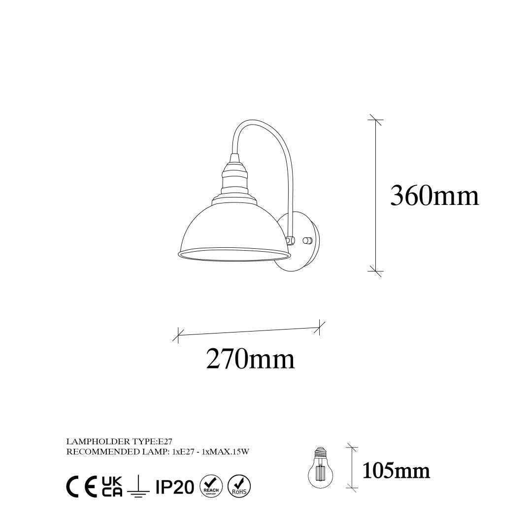 With a size of 27 x 27 cm and a total height of 36 cm, our Vintage Wall Lamp is designed to provide the ideal amount of light and create a cozy atmosphere in any space. The cap's diameter of 21 cm and height of 20 cm ensures a wide and balanced distribution of light, while the base plate's diameter of 12 cm and height of 3 cm adds stability and elegance to the overall design.