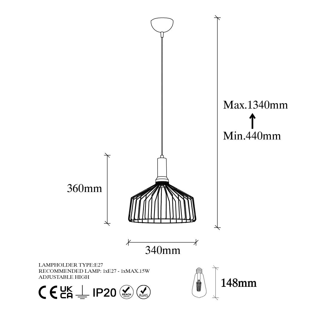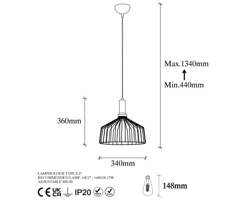 With a size of 34 x 34 cm and a total height adjustable from 44 to 134 cm, this chandelier is designed to fit seamlessly into any space. The cap's diameter of 34 cm and height of 36 cm provide ample illumination, creating a warm and inviting atmosphere. The base plate, with a diameter of 10 cm and height of 6 cm, adds stability and balance to the overall design.