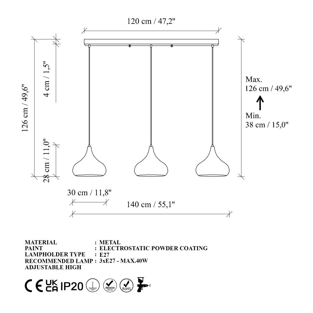- Socket Type: 3 x E 27 Max 40 W