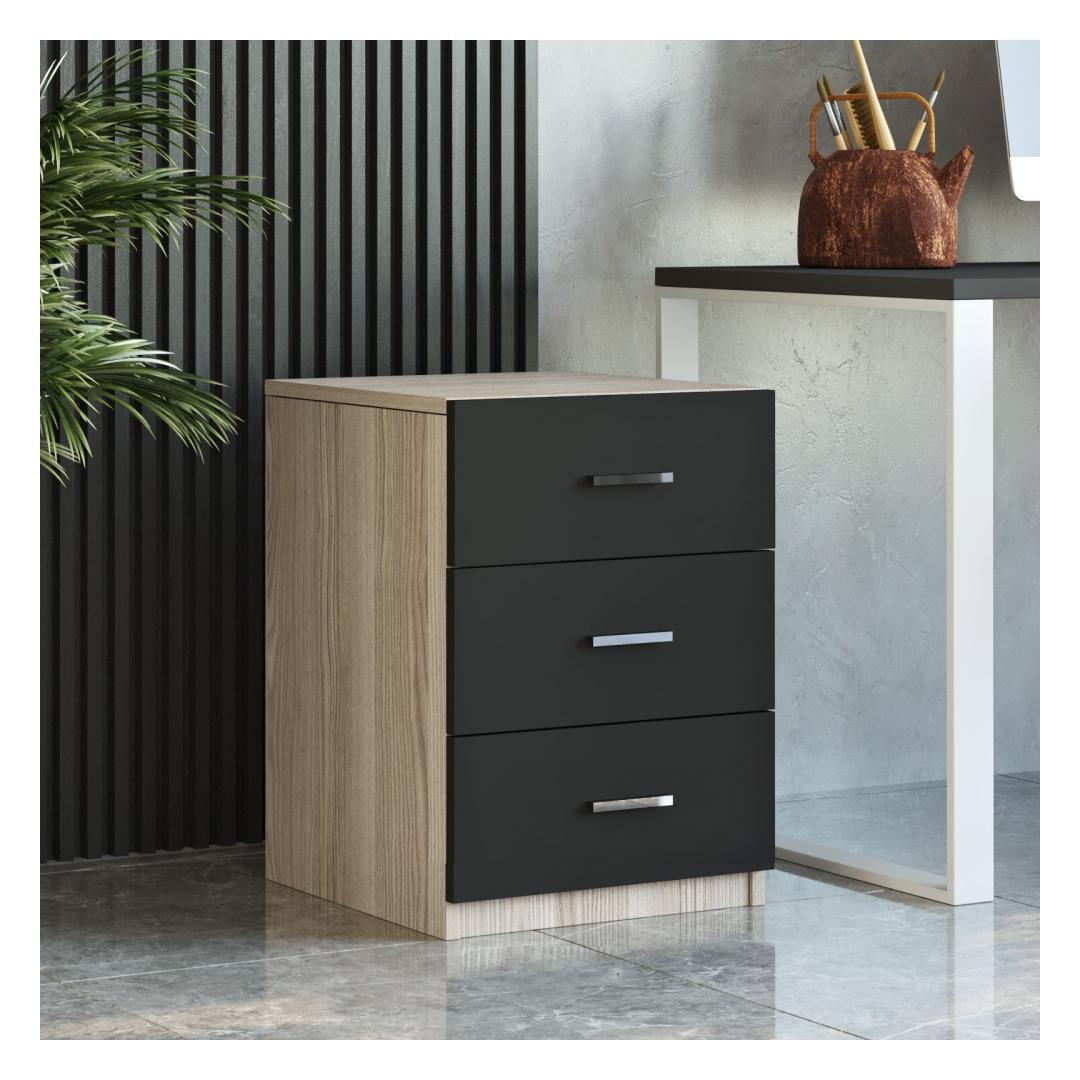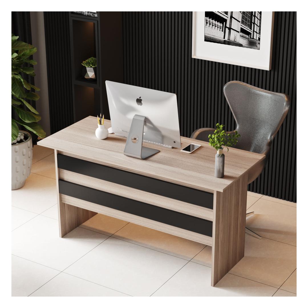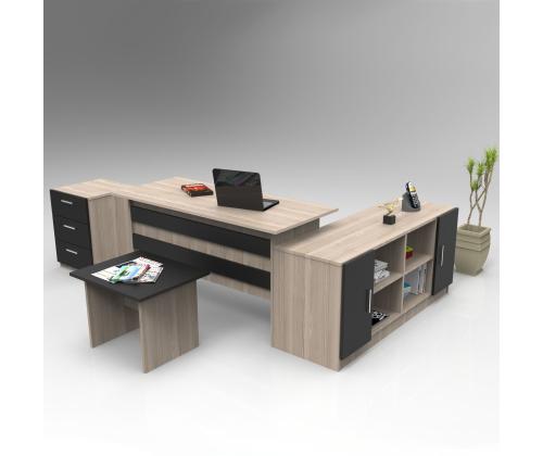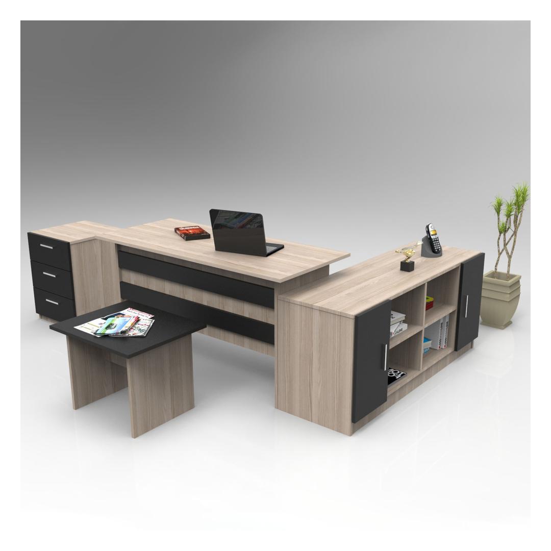 The set also features a stylish coffee table, drawer, and console, all designed to complement each other and create a cohesive look in your office. The oak and black color combination adds a touch of sophistication and elegance to any workspace.
