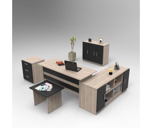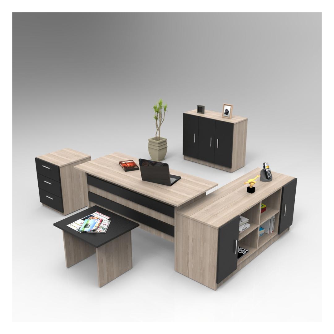 The set includes a spacious study desk, a convenient coffee table, a practical drawer, a versatile multi-purpose cabinet, and a sleek console. Each piece is meticulously designed to provide ample storage space and keep your office essentials within reach.