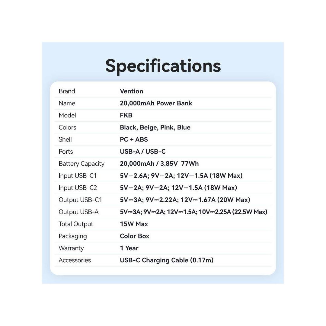 POWER BANK USB 20000MAH 22.5W/BLUE FKBL0-C VENTION