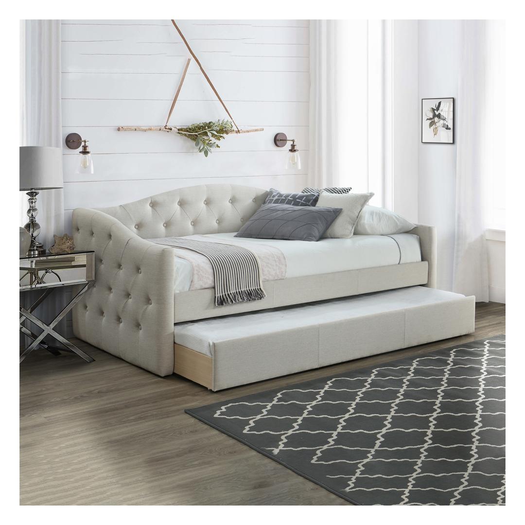 Bed ATLANTA 90x200cm, without mattresses, grey. Under the bed is an additional fold-out sleeping area. The space-saving solution is convenient and easy to use. The bed frame is made of MDF board and covered with grey polyester fabric. The set includes bed base slats. The mattresses are not included. The dimensions of the suitable mattresses are 90x200cm. The height of the additional mattress can be up to 20cm. The overall dimensions of the bed are 98x221xH94cm. Voodi ATLANTA 90x200cm, ilma madratsiteta, hall. Voodi all on väljatõmmatav osa, mida saab kasutada lisamagamiskohana. Voodi kergelt polsterdatud korpus on valmistatud MDF plaadist ja kaetud halli polüesterkangaga. Madratsid ei kuulu komplekti. Sobivate madratsite mõõdud on 90x200cm. Lisamagamiskoha madratsi kõrgus võib olla kuni 20cm. Põhjalipid kuuluvad komplekti. Voodi üldmõõdud on 98x221xH94cm.