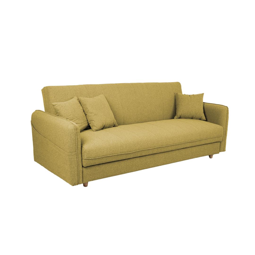Diivanvoodi VISBY pesukastiga, kollane. Diivani kattematerjal: 100% polüesterkangas. Karkass: puit, vineer. Polsterdus: polüuretaanvaht. Diivanil on lihtne click-clack mehhanism. Istme all on panipaik. Diivani üldmõõdud on 200x88xH93cm. Diivanvoodi mõõdud avatuna on 180x110xH46cm. Diivanil on heledad puidust jalad.